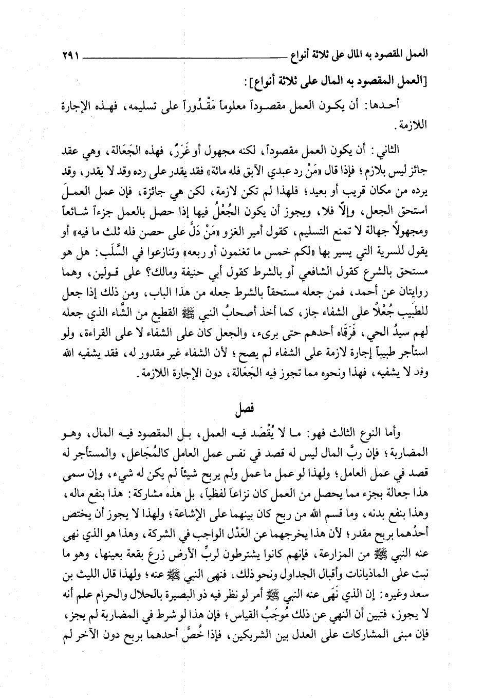 وَأَمَّا النَّوْعُ الثَّالِثُ فَهُوَ: مَا لَا يُقْصَدُ فِيهِ الْعَمَلُ، بَلْ الْمَقْصُودُ فِيهِ الْمَالُ، وَهُوَ الْمُضَارَبَةُ، فَإِنَّ رَبَّ الْمَالِ لَيْسَ لَهُ قَصْدٌ فِي نَفْسِ عَمَلِ الْعَامِلِ كَالْمُجَاعِلِ، وَالْمُسْتَأْجِرُ لَهُ قَصْدٌ فِي عَمَلِ الْعَامِلِ، وَلِهَذَا لَوْ عَمِلَ مَا عَمِلَ وَلَمْ يَرْبَحْ شَيْئًا لَمْ يَكُنْ لَهُ شَيْءٌ، وَإِنْ سَمَّى هَذَا جَعَالَةً بِجُزْءٍ مِمَّا يَحْصُلُ مِنْ الْعَمَلِ كَانَ نِزَاعًا لَفْظِيًّا، بَلْ هَذِهِ مُشَارَكَةٌ: هَذَا بِنَفْعِ مَالِهِ، وَهَذَا بِنَفْعِ بَدَنِهِ، وَمَا قَسَمَ اللَّهُ مِنْ رِبْحٍ كَانَ بَيْنَهُمَا عَلَى الْإِشَاعَةِ، وَلِهَذَا لَا يَجُوزُ أَنْ يَخْتَصَّ أَحَدُهُمَا بِرِبْحٍ مُقَدَّرٍ؛ لِأَنَّ هَذَا يُخْرِجُهُمَا عَنْ الْعَدْلِ الْوَاجِبِ فِي الشَّرِكَةِ، وَهَذَا هُوَ الَّذِي نَهَى عَنْهُ النَّبِيُّ - صَلَّى اللَّهُ عَلَيْهِ وَسَلَّمَ - مِنْ الْمُزَارَعَةِ، فَإِنَّهُمْ كَانُوا يَشْتَرِطُونَ لِرَبِّ الْأَرْضِ زَرْعَ بُقْعَةٍ بِعَيْنِهَا، وَهُوَ مَا نَبَتَ عَلَى الْمَاذِيَانَاتِ وَأَقْبَالِ الْجَدَاوِلِ وَنَحْوِ ذَلِكَ، فَنَهَى النَّبِيُّ - صَلَّى اللَّهُ عَلَيْهِ وَسَلَّمَ - عَنْهُ، وَلِهَذَا قَالَ اللَّيْثُ بْنُ سَعْدٍ وَغَيْرُهُ: إنَّ الَّذِي نَهَى عَنْهُ النَّبِيُّ - صَلَّى اللَّهُ عَلَيْهِ وَسَلَّمَ - أَمْرٌ لَوْ نَظَرَ فِيهِ ذُو الْبَصِيرَةِ بِالْحَلَالِ وَالْحَرَامِ عَلِمَ أَنَّهُ لَا يَجُوزُ، فَتَبَيَّنَ أَنَّ النَّهْيَ عَنْ ذَلِكَ مُوجَبُ الْقِيَاسِ، فَإِنَّ هَذَا لَوْ شُرِطَ فِي الْمُضَارَبَةِ لَمْ يَجُزْ، فَإِنَّ مَبْنَى الْمُشَارَكَاتِ عَلَى الْعَدْلِ بَيْنَ الشَّرِيكَيْنِ، فَإِذَا خُصَّ أَحَدُهُمَا بِرِبْحٍ دُونَ الْآخَرِ لَمْ