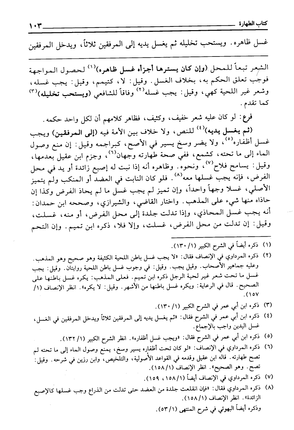 (ثُمَّ يَغْسِلَ يَدَيْهِ) لِلنَّصِّ، وَلَا خِلَافَ بَيْنَ الْأُمَّةِ فِيهِ (إِلَى الْمِرْفَقَيْنِ) وَيَجِبُ غَسْلُ أَظْفَارِهِ، وَلَا يَضُرُّ وَسَخٌ يَسِيرٌ فِي الْأَصَحِّ كَبَرَاجِمِهِ، وَقِيلَ: إِنْ مَنَعَ وُصُولَ الْمَاءِ إِلَى مَا تَحْتَهُ كَشَمْعٍ فَفِي صِحَّةِ طَهَارَتِهِ وَجْهَانِ، وَجَزَمَ ابْنُ عَقِيلٍ بِعَدَمِهَا، وَقِيلَ: يُسَامَحُ فَلَّاحٌ، وَنَحْوُهُ، وَظَاهِرُهُ أَنَّهُ إِذَا نَبَتَ لَهُ إِصْبَعٌ زَائِدَةٌ أَوْ يَدٌ فِي مَحَلِّ الْفَرْضِ فَإِنَّهُ يَجِبُ غَسْلُهَا مَعَهُ، فَلَوْ كَانَ النَّابِتُ فِي الْعَضُدِ أَوِ الْمَنْكِبِ، وَلَمْ يَتَمَيَّزِ الْأَصْلِيُّ غُسِلَا وَجْهًا وَاحِدًا، وَإِنْ تَمَيَّزَ لَمْ يَجِبْ غَسْلُ مَا لَمْ يُحَاذِ الْفَرْضَ، وَكَذَا إِنْ حَاذَاهُ مِنْهَا شَيْءٌ عَلَى الْمَذْهَبِ، وَاخْتَارَ الْقَاضِي، وَالشِّيرَازِيُّ، وَصَحَّحَهُ ابْنُ حَمْدَانَ: أَنَّهُ يَجِبُ غَسْلُ الْمُحَاذِي، وَإِذَا تَدَلَّتْ جِلْدَةٌ إِلَى مَحَلِّ الْفَرْضِ، أَوْ مِنْهُ غُسِلَتْ، وَقِيلَ: إِنْ تَدَلَّتْ مِنْ مَحَلِّ الْفَرْضِ غُسِلَتْ، وَإِلَّا فَلَا، ذَكَرَهُ ابْنُ تَمِيمٍ، وَإِنِ الْتَحَمَ