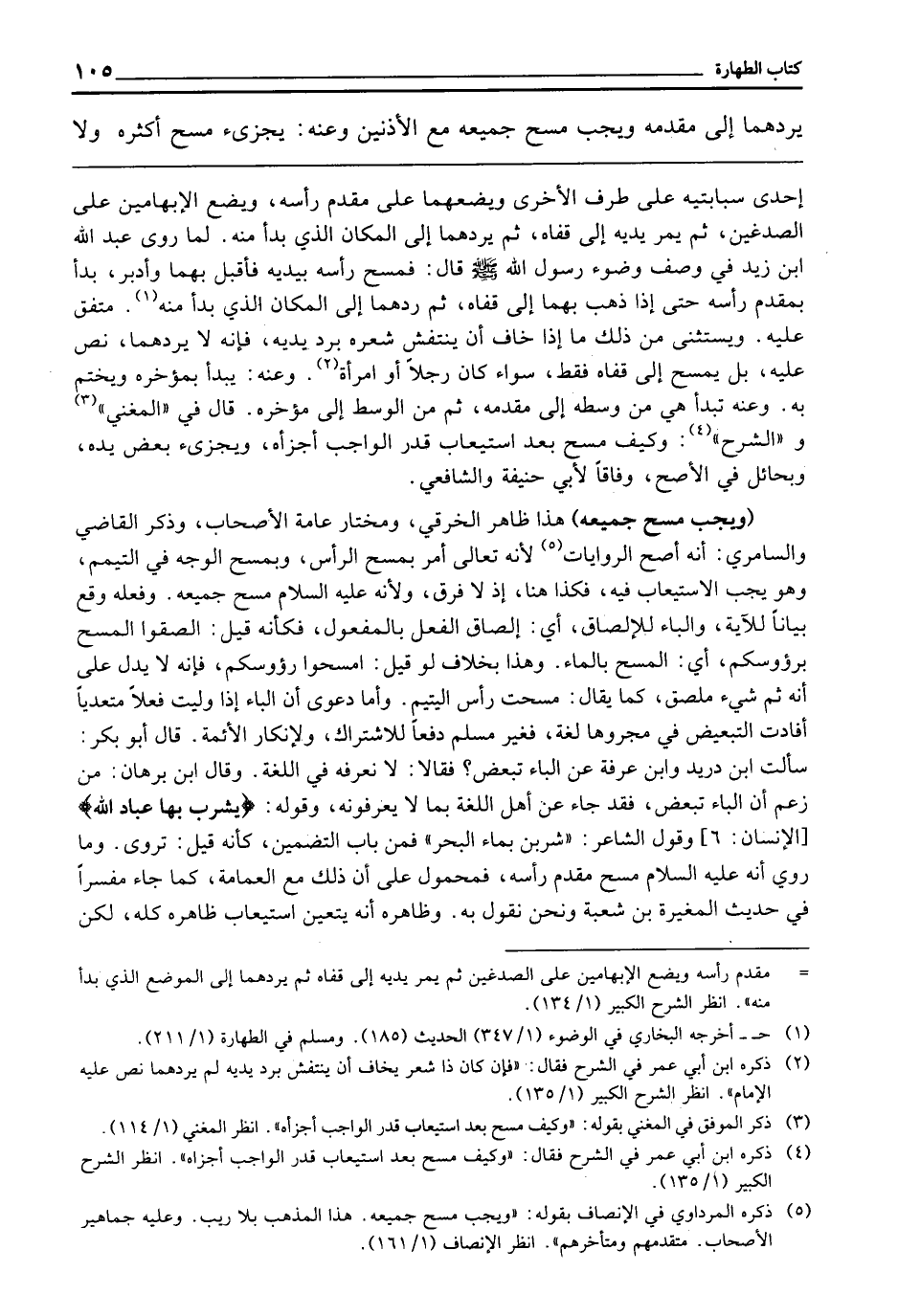 (وَيَجِبُ مَسْحُ جَمِيعِهِ) هَذَا ظَاهِرُ الْخِرَقِيِّ، وَمُخْتَارُ عَامَّةِ الْأَصْحَابِ، وَذَكَرَ الْقَاضِي، وَالسَّامِرِيُّ: أَنَّهُ أَصَحُّ الرِّوَايَاتِ، لِأَنَّهُ تَعَالَى أَمَرَ بِمَسْحِ الرَّأْسِ، وَبِمَسْحِ الْوَجْهِ فِي التَّيَمُّمِ، وَهُوَ يَجِبُ الِاسْتِيعَابُ فِيهِ، فَكَذَا هُنَا إِذْ لَا فَرْقَ، وَلِأَنَّهُ - عَلَيْهِ السَّلَامُ - مَسَحَ جَمِيعَهُ، وَفِعْلُهُ وَقَعَ بَيَانًا لِلْآيَةِ، وَالْبَاءُ لِلْإِلْصَاقِ أَيْ: إِلْصَاقِ الْفِعْلِ بِالْمَفْعُولِ فَكَأَنَّهُ قِيلَ: أَلْصِقُوا الْمَسْحَ بِرُءُوسِكُمْ أَيِ: الْمَسْحَ بِالْمَاءِ، وَهَذَا بِخِلَافِ لَوْ قِيلَ: امْسَحُوا رُءُوسَكُمْ، فَإِنَّهُ لَا يَدُلُّ عَلَى أَنَّهُ، ثَمَّ شَيْءٌ مُلْصَقٌ، كَمَا يُقَالُ: مَسَحْتُ رَأْسَ الْيَتِيمِ، وَأَمَّا دَعْوَى أَنَّ الْبَاءَ إِذَا وَلِيَتْ فِعْلًا مُتَعَدِّيًا أَفَادَتِ التَّبْعِيضَ فِي مَجْرُورِهَا لُغَةً، فَغَيْرُ مُسَلَّمٍ دَفْعًا لِلِاشْتِرَاكِ، وَلِإِنْكَارِ الْأَئِمَّةِ، قَالَ أَبُو بَكْرٍ: سَأَلْتُ ابْنَ دُرَيْدٍ، وَابْنَ عَرَفَةَ عَنِ الْبَاءِ تُبَعِّضُ؛ فَقَالَا: لَا نَعْرِفُهُ فِي اللُّغَةِ، وَقَالَ ابْنُ بُرْهَانٍ: مَنْ زَعَمَ أَنَّ الْبَاءَ تُبَعِّضُ فَقَدْ جَاءَ عَنْ أَهْلِ اللُّغَةِ بِمَا لَا يَعْرِفُونَهُ، وَقَوْلُهُ {يَشْرَبُ بِهَا عِبَادُ اللَّهِ} [الإنسان: 6] ، وَقَوْلُ الشَّاعِرِ: