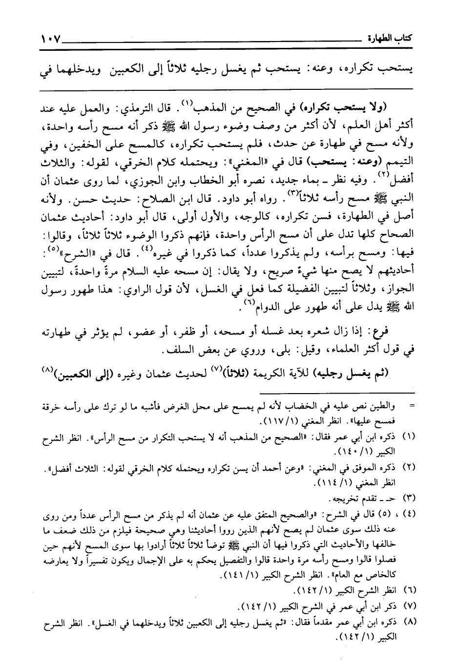 يُسْتَحَبُّ تَكْرَارُهُ، وَعَنْهُ: يُسْتَحَبُّ، ثُمَّ يَغْسِلَ رِجْلَيْهِ ثَلَاثًا إِلَى الْكَعْبَيْنِ وَيُدْخِلَهُمَا فِي