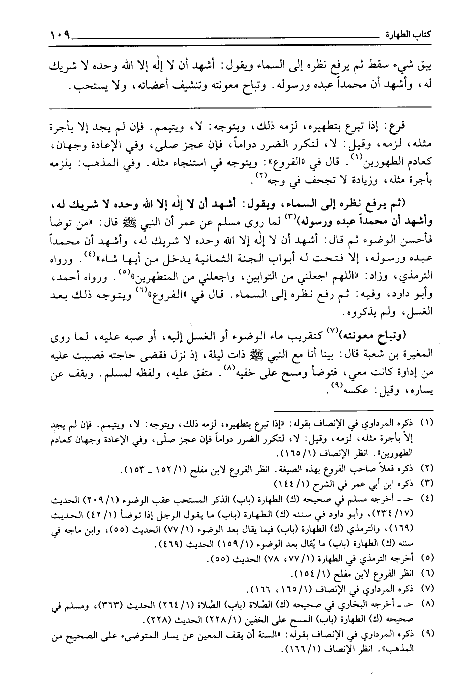 (ثُمَّ يَرْفَعَ نَظَرَهُ إِلَى السَّمَاءِ، وَيَقُولَ: أَشْهَدُ أَنْ لَا إِلَهَ إِلَّا اللَّهُ وَحْدَهُ لَا شَرِيكَ لَهُ، وَأَشْهَدُ أَنَّ مُحَمَّدًا عَبْدُهُ وَرَسُولُهُ) لِمَا رَوَى مُسْلِمٌ، عَنْ عُمَرَ أَنَّ النَّبِيَّ - صَلَّى اللَّهُ عَلَيْهِ وَسَلَّمَ - قَالَ: «مَنْ تَوَضَّأَ فَأَحْسَنَ الْوُضُوءَ، ثُمَّ قَالَ: أَشْهَدُ أَنْ لَا إِلَهَ إِلَّا اللَّهُ وَحْدَهُ لَا شَرِيكَ لَهُ، وَأَشْهَدُ أَنَّ مُحَمَّدًا عَبْدُهُ وَرَسُولُهُ إِلَّا فُتِحَتْ لَهُ أَبْوَابُ الْجَنَّةِ الثَّمَانِيَةُ يَدْخُلُ مِنْ أَيِّهَا شَاءَ» وَرَوَاهُ التِّرْمِذِيُّ، وَزَادَ "اللَّهُمَّ اجْعَلْنِي مِنَ التَّوَّابِينَ، وَاجْعَلْنِي مِنَ الْمُتَطَهِّرِينَ" وَرَوَاهُ أَحْمَدُ، وَأَبُو دَاوُدَ، وَفِيهِ «ثُمَّ رَفَعَ نَظَرَهُ إِلَى السَّمَاءِ» قَالَ فِي " الْفُرُوعِ ": وَيَتَوَجَّهُ ذَلِكَ بَعْدَ الْغَسْلِ، وَلَمْ يَذْكُرُوهُ.