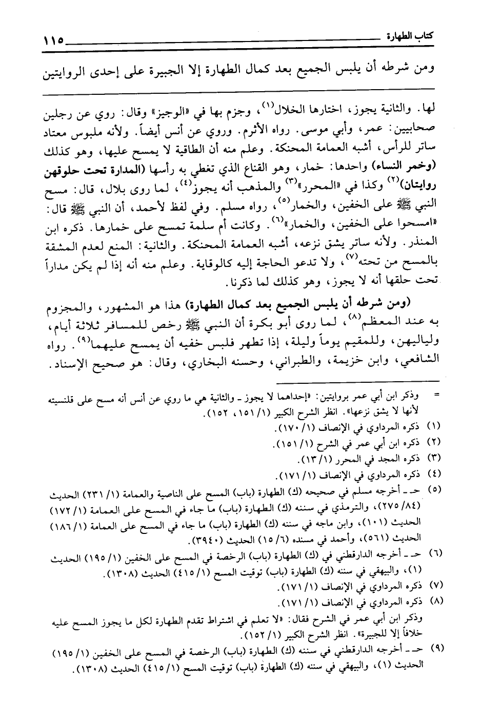 (وَمِنْ شَرْطِهِ أَنْ يَلْبَسَ الْجَمِيعَ بَعْدَ كَمَالِ الطَّهَارَةِ) هَذَا هُوَ الْمَشْهُورُ، وَالْمَجْزُومُ بِهِ عِنْدَ الْمُعْظَمِ، لِمَا رَوَى أَبُو بَكْرَةَ: «أَنَّ النَّبِيَّ - صَلَّى اللَّهُ عَلَيْهِ وَسَلَّمَ - رَخَّصَ لِلْمُسَافِرِ ثَلَاثَةَ أَيَّامٍ وَلَيَالِيَهُنَّ، وَلِلْمُقِيمِ يَوْمًا وَلَيْلَةً، إِذَا تَطَهَّرَ فَلَبِسَ خُفَّيْهِ أَنْ يَمْسَحَ عَلَيْهِمَا» رَوَاهُ الشَّافِعِيُّ، وَابْنُ خُزَيْمَةَ، وَالطَّبَرَانِيُّ، وَحَسَّنَهُ الْبُخَارِيُّ، وَقَالَ: هُوَ صَحِيحُ الْإِسْنَادِ.