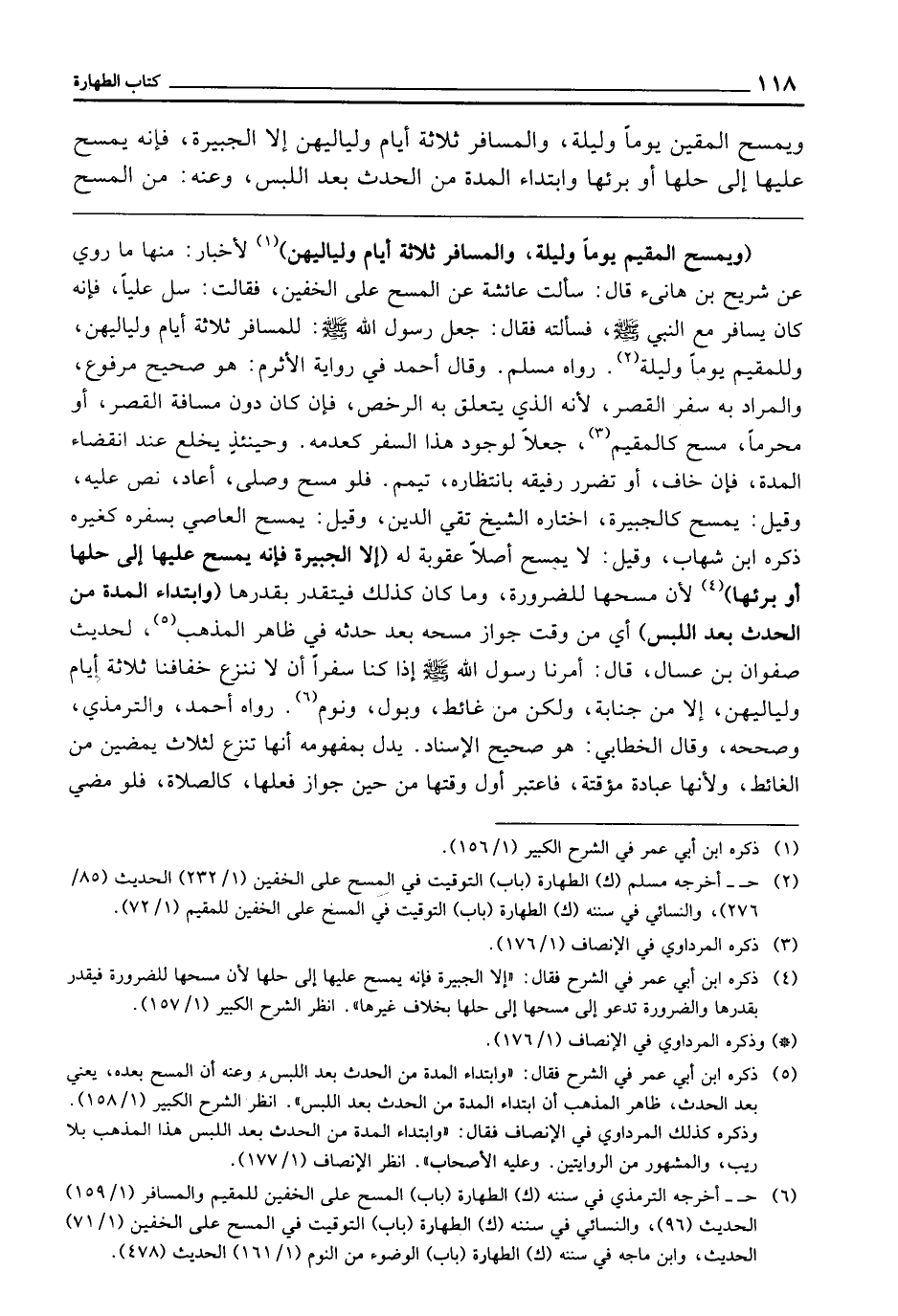 (وَيَمْسَحُ الْمُقِيمُ يَوْمًا وَلَيْلَةً، وَالْمُسَافِرُ ثَلَاثَةَ أَيَّامٍ وَلَيَالِيَهُنَّ) لِأَخْبَارٍ: مِنْهَا مَا رُوِيَ عَنْ شُرَيْحِ بْنِ هَانِئٍ قَالَ: «سَأَلْتُ عَائِشَةَ عَنِ الْمَسْحِ عَلَى الْخُفَّيْنِ، فَقَالَتْ: سَلْ عَلِيًّا فَإِنَّهُ كَانَ يُسَافِرُ مَعَ النَّبِيِّ - صَلَّى اللَّهُ عَلَيْهِ وَسَلَّمَ - فَسَأَلْتُهُ، فَقَالَ: جَعَلَ رَسُولُ اللَّهِ - صَلَّى اللَّهُ عَلَيْهِ وَسَلَّمَ - لِلْمُسَافِرِ ثَلَاثَةَ أَيَّامٍ وَلَيَالِيَهُنَّ، وَلِلْمُقِيمِ يَوْمًا وَلَيْلَةً رَوَاهُ مُسْلِمٌ، وَقَالَ أَحْمَدُ فِي رِوَايَةِ الْأَثْرَمِ: هُوَ صَحِيحٌ مَرْفُوعٌ» ، وَالْمُرَادُ بِهِ سَفَرُ الْقَصْرِ، لِأَنَّهُ الَّذِي يَتَعَلَّقُ بِهِ الرُّخَصُ، فَإِنْ كَانَ دُونَ مَسَافَةِ الْقَصْرِ، أَوْ مُحْرِمًا مَسَحَ كَالْمُقِيمِ، جَعْلًا لِوُجُودِ هَذَا السَّفَرِ كَعَدَمِهِ، وَحِينَئِذٍ يَخْلَعُ عِنْدَ انْقِضَاءِ الْمُدَّةِ، فَإِنْ خَافَ، أَوْ تَضَرَّرَ رَفِيقُهُ بِانْتِظَارِهِ تَيَمَّمَ، فَلَوْ مَسَحَ وَصَلَّى أَعَادَ، نَصَّ عَلَيْهِ، وَقِيلَ: يَمْسَحُ كَالْجَبِيرَةِ اخْتَارَهُ الشَّيْخُ تَقِيُّ الدِّينِ، وَقِيلَ: يَمْسَحُ الْعَاصِي بِسَفَرِهِ كَغَيْرِهِ ذَكَرَهُ ابْنُ شِهَابٍ، وَقِيلَ: لَا يَمْسَحُ أَصْلًا عُقُوبَةً لَهُ (إِلَّا الْجَبِيرَةَ فَإِنَّهُ يَمْسَحُ عَلَيْهَا إِلَى حَلِّهَا، أَوْ بُرْئِهَا) لِأَنَّ مَسْحَهَا لِلضَّرُورَةِ، وَمَا كَانَ كَذَلِكَ فَيَتَقَدَّرُ بِقَدْرِهَا (وَابْتِدَاءُ الْمُدَّةِ مِنَ الْحَدَثِ بَعْدَ اللُّبْسِ) أَيْ: مِنْ وَقْتِ جَوَازِ مَسْحِهِ بَعْدَ حَدَثِهِ فِي ظَاهِرِ الْمَذْهَبِ، لِحَدِيثِ صَفْوَانَ بْنِ عَسَّالٍ قَالَ: «أَمَرَنَا رَسُولُ اللَّهِ - صَلَّى اللَّهُ عَلَيْهِ وَسَلَّمَ - إِذَا كُنَّا سَفْرًا، أَنْ لَا نَنْزِعَ خِفَافَنَا ثَلَاثَةَ أَيَّامٍ وَلَيَالِيَهُنَّ إِلَّا مِنْ جَنَابَةٍ، وَلَكِنْ مِنْ غَائِطٍ، وَبَوْلٍ، وَنَوْمٍ» . رَوَاهُ أَحْمَدُ، وَالتِّرْمِذِيُّ، وَصَحَّحَهُ، وَقَالَ الْخَطَّابِيُّ: هُوَ صَحِيحُ الْإِسْنَادِ، يَدُلُّ بِمَفْهُومِهِ أَنَّهَا تُنْزَعُ لِثَلَاثٍ يَمْضِينَ مِنَ الْغَائِطِ، وَلِأَنَّهَا عِبَادَةٌ مُؤَقَّتَةٌ، فَاعْتُبِرَ أَوَّلُ وَقْتِهَا مِنْ حِينِ جَوَازِ فِعْلِهَا كَالصَّلَاةِ، فَلَوْ مَضَى