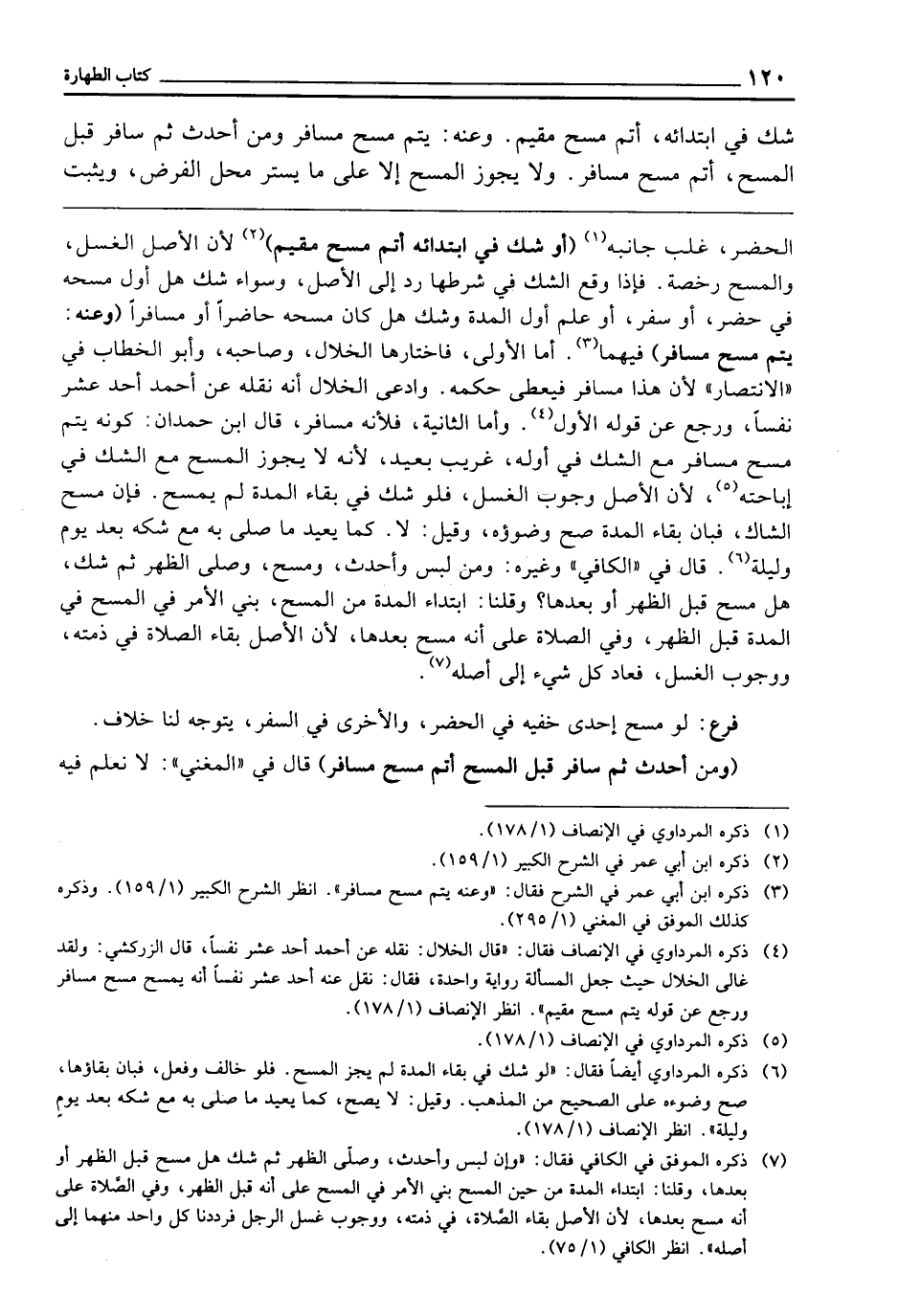 ـــــــــــــــــــــــــــــQالْحَضَرِ غَلَبَ جَانِبُهُ (أَوْ شَكَّ فِي ابْتِدَائِهِ أَتَمَّ مَسْحَ مُقِيمٍ) لِأَنَّ الْأَصْلَ الْغَسْلُ، وَالْمَسْحَ رُخْصَةٌ، فَإِذَا وَقَعَ الشَّكُّ فِي شَرْطِهَا رُدَّ إِلَى الْأَصْلِ، وَسَوَاءٌ شَكَّ هَلْ أَوَّلُ مَسْحِهِ فِي حَضَرٍ أَوْ سَفَرٍ، أَوْ عَلِمَ أَوَّلَ الْمُدَّةِ، وَشَكَّ هَلْ كَانَ مَسْحُهُ حَاضِرًا أَوْ مُسَافِرًا (وَعَنْهُ: يُتِمُّ مَسْحَ مُسَافِرٍ) فِيهِمَا، أَمَّا الْأُولَى فَاخْتَارَهَا الْخَلَّالُ، وَصَاحِبُهُ، وَأَبُو الْخَطَّابِ فِي " الِانْتِصَارِ "، لِأَنَّ هَذَا مُسَافِرٌ فَيُعْطَى حُكْمُهُ. وَادَّعَى الْخَلَّالُ أَنَّهُ نَقَلَهُ عَنْ أَحْمَدَ أَحَدَ عَشَرَ نَفْسًا، وَرَجَعَ عَنْ قَوْلِهِ الْأَوَّلِ; وَأَمَّا الثَّانِيَةُ: فَلِأَنَّهُ مُسَافِرٌ، قَالَ ابْنُ حَمْدَانَ: كَوْنُهُ يُتِمُّ مَسْحَ مُسَافِرٍ مَعَ الشَّكِّ فِي أَوَّلِهِ غَرِيبٌ بَعِيدٌ، لِأَنَّهُ لَا يَجُوزُ الْمَسْحُ مَعَ الشَّكِّ فِي إِبَاحَتِهِ، لِأَنَّ الْأَصْلَ وُجُوبُ الْغَسْلِ، فَلَوْ شَكَّ فِي بَقَاءِ الْمُدَّةِ لَمْ يَمْسَحْ، فَإِنْ مَسَحَ الشَّاكُّ، فَبَانَ بَقَاءُ الْمُدَّةِ صَحَّ وُضُوءُهُ، وَقِيلَ: لَا، كَمَا يُعِيدُ مَا صَلَّى بِهِ مَعَ شَكِّهِ بَعْدَ يَوْمٍ وَلَيْلَةٍ.