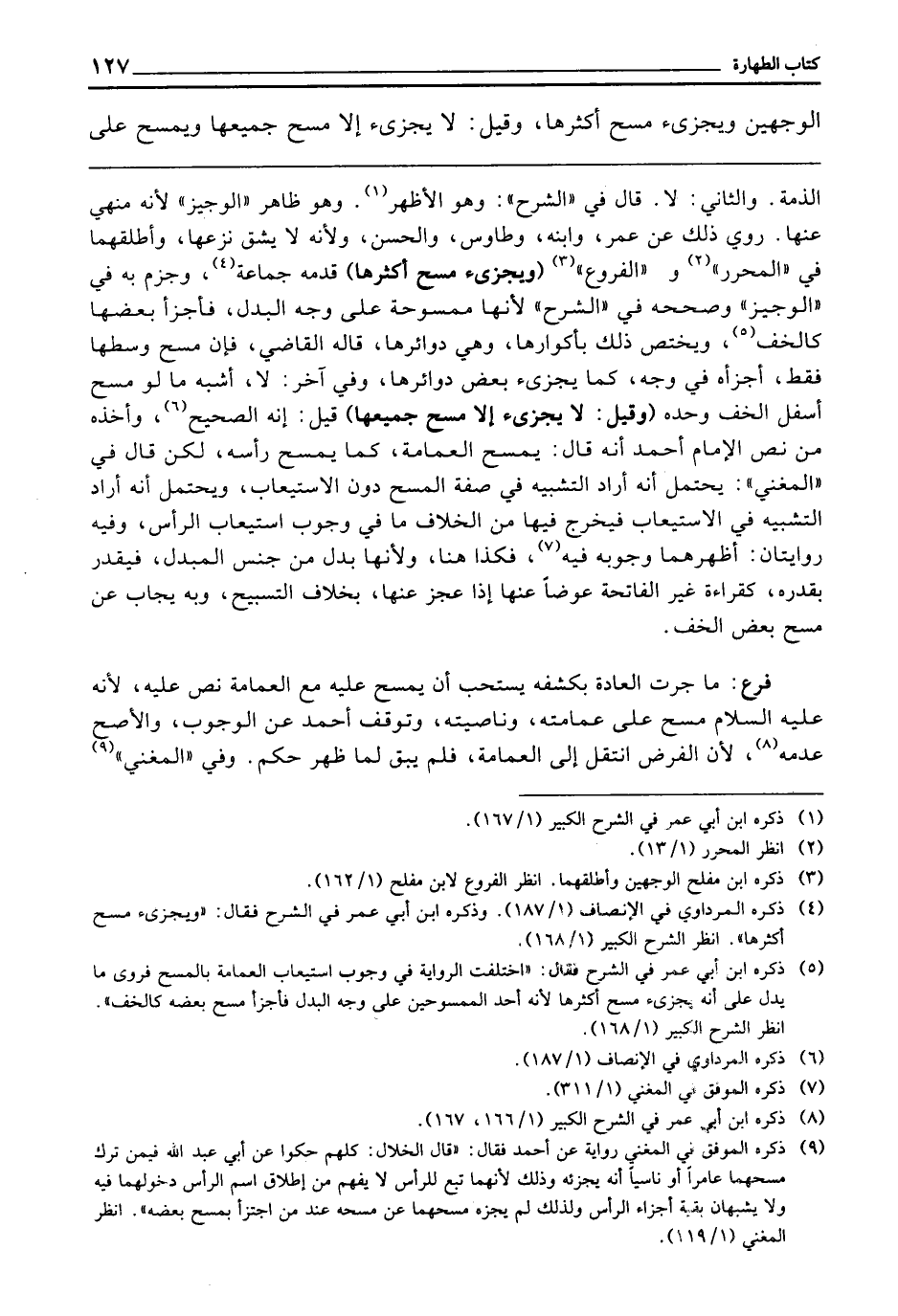 ـــــــــــــــــــــــــــــQالذِّمَّةِ، وَالثَّانِي: لَا، قَالَ فِي " الشَّرْحِ ": وَهُوَ الْأَظْهَرُ، وَهُوَ ظَاهِرُ " الْوَجِيزِ " لِأَنَّهُ مَنْهِيٌّ عَنْهَا، رُوِيَ ذَلِكَ عَنْ عُمَرَ، وَابْنِهِ، وَطَاوُسٍ، وَالْحَسَنِ، وَلِأَنَّهُ لَا يَشُقُّ نَزْعُهَا، وَأَطْلَقَهُمَا فِي " الْمُحَرَّرِ " و" الْفُرُوعِ " (وَيُجْزِئُ مَسْحُ أَكْثَرِهَا) قَدَّمَهُ جَمَاعَةٌ، وَجَزَمَ بِهِ فِي " الْوَجِيزِ " وَصَحَّحَهُ فِي " الشَّرْحِ " لِأَنَّهَا مَمْسُوحَةٌ عَلَى وَجْهِ الْبَدَلِ، فَأَجْزَأَ بَعْضُهَا كَالْخُفِّ، وَيَخْتَصُّ ذَلِكَ بِأَكْوَارِهَا، وَهِيَ دَوَائِرُهَا، قَالَهُ الْقَاضِي، فَإِنْ مَسَحَ وَسَطَهَا فَقَطْ أَجْزَأَهُ فِي وَجْهٍ كَمَا يُجْزِئُ بَعْضُ دَوَائِرِهَا، وَفِي آخَرَ: لَا، أَشْبَهَ مَا لَوْ مَسَحَ أَسْفَلَ الْخُفِّ وَحْدَهُ (وَقِيلَ: لَا يُجْزِئُ إِلَّا مَسْحُ جَمِيعِهَا) قِيلَ: إِنَّهُ الصَّحِيحُ، وَأَخَذَهُ مِنْ نَصِّ الْإِمَامِ أَحْمَدَ أَنَّهُ قَالَ: يَمْسَحُ الْعِمَامَةَ كَمَا يَمْسَحُ رَأْسَهُ، لَكِنْ قَالَ فِي " الْمُغْنِي ": يُحْتَمَلُ أَنَّهُ أَرَادَ التَّشْبِيهَ فِي صِفَةِ الْمَسْحِ دُونَ الِاسْتِيعَابِ، وَيُحْتَمَلُ أَنَّهُ أَرَادَ التَّشْبِيهَ فِي الِاسْتِيعَابِ فَيَخْرُجُ فِيهَا مِنَ الْخِلَافِ مَا فِي وُجُوبِ اسْتِيعَابِ الرَّأْسِ، وَفِيهِ رِوَايَتَانِ: أَظْهَرُهُمَا وُجُوبُهُ فِيهِ، فَكَذَا هُنَا، وَلِأَنَّهَا بَدَلٌ مِنْ جِنْسِ الْمُبْدَلِ، فَيُقَدَّرُ بِقَدْرِهِ، كَقِرَاءَةِ الْفَاتِحَةِ عِوَضًا عَنْهَا إِذَا عَجَزَ عَنْهَا، بِخِلَافِ التَّسْبِيحِ، وَبِهِ يُجَابُ عَنْ مَسْحِ بَعْضِ الْخُفِّ.