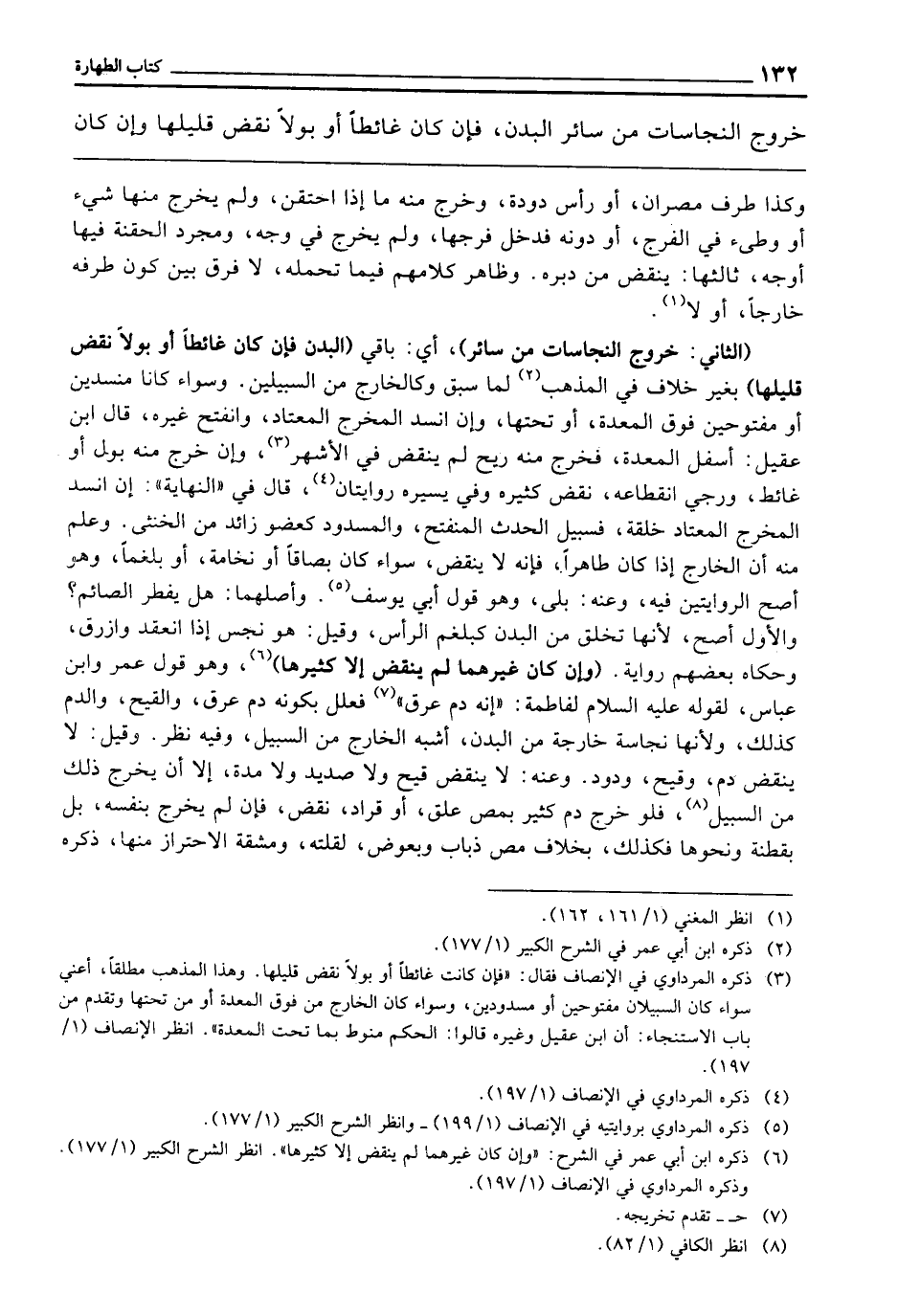 (الثَّانِي: خُرُوجُ النَّجَاسَاتِ مِنْ سَائِرِ) أَيْ: بَاقِي (الْبَدَنِ فَإِنْ كَانَ غَائِطًا أَوْ بَوْلًا نَقَضَ قَلِيلُهَا) بِغَيْرِ خِلَافٍ فِي الْمَذْهَبِ لِمَا سَبَقَ، وَكَالْخَارِجِ مِنَ السَّبِيلَيْنِ، وَسَوَاءٌ كَانَا مُنْسَدَّيْنِ، أَوْ مَفْتُوحَيْنِ فَوْقَ الْمَعِدَةِ أَوْ تَحْتَهَا، وَإِنِ انْسَدَّ الْمَخْرَجُ الْمُعْتَادُ، وَانْفَتَحَ غَيْرُهُ، قَالَ ابْنُ عَقِيلٍ: أَسْفَلَ الْمَعِدَةِ، فَخَرَجَ مِنْهُ رِيحٌ لَمْ يَنْقُضْ فِي الْأَشْهَرِ، وَإِنْ خَرَجَ مِنْهُ بَوْلٌ أَوْ غَائِطٌ، وَرُجِيَ انْقِطَاعُهُ نَقَضَ كَثِيرُهُ، وَفِي يَسِيرِهِ رِوَايَتَانِ، قَالَ فِي " النِّهَايَةِ ": إِنِ انْسَدَّ الْمَخْرَجُ الْمُعْتَادُ خِلْقَةً، فَسَبِيلُ الْحَدَثِ الْمُنْفَتِحُ، وَالْمَسْدُودُ كَعُضْوٍ زَائِدٍ مِنَ الْخُنْثَى، وَعُلِمَ مِنْهُ أَنَّ الْخَارِجَ إِذَا كَانَ طَاهِرًا فَإِنَّهُ لَا يَنْقُضُ، سَوَاءٌ كَانَ بُصَاقًا، أَوْ نُخَامَةً، أَوْ بَلْغَمًا، وَهُوَ أَصَحُّ الرِّوَايَتَيْنِ فِيهِ، وَعَنْهُ: بَلَى، وَهُوَ قَوْلُ أَبِي يُوسُفَ، وَأَصْلُهُمَا هَلْ يُفْطِرُ الصَّائِمُ؟ وَالْأَوَّلُ: أَصَحُّ، لِأَنَّهَا تُخْلَقُ مِنَ الْبَدَنِ كَبَلْغَمِ الرَّأْسِ، وَقِيلَ: هُوَ نَجِسٌ إِذَا انْعَقَدَ، وَازْرَقَّ، وَحَكَاهُ بَعْضُهُمْ رِوَايَةً (وَإِنْ كَانَ غَيْرَهُمَا لَمْ يَنْقُضْ إِلَّا كَثِيرُهَا) وَهُوَ قَوْلُ عُمَرَ، وَابْنِ عَبَّاسٍ لِقَوْلِهِ - عَلَيْهِ السَّلَامُ - لِفَاطِمَةَ: «إِنَّهُ دَمُ عِرْقٍ» فَعَلَّلَ بِكَوْنِهِ دَمَ عِرْقٍ، وَالْقَيْحُ وَالدَّمُ كَذَلِكَ، وَلِأَنَّهَا نَجَاسَةٌ خَارِجَةٌ مِنَ الْبَدَنِ أَشْبَهَ الْخَارِجَ مِنَ السَّبِيلِ، وَفِيهِ نَظَرٌ، وَقِيلَ: لَا يَنْقُضُ دَمٌ، وَقَيْحٌ، وَدُودٌ، وَعَنْهُ: لَا يَنْقُضُ قَيْحٌ، وَلَا صَدِيدٌ، وَلَا مِدَّةٌ، إِلَّا أَنْ يَخْرُجَ ذَلِكَ مِنَ السَّبِيلِ، فَلَوْ خَرَجَ دَمٌ كَثِيرٌ بِمَصِّ عَلَقٍ، أَوْ قُرَادٍ نَقَضَ، فَإِنْ لَمْ يَخْرُجْ بِنَفْسِهِ بَلْ بِقُطْنَةٍ، وَنَحْوِهَا، فَكَذَلِكَ، بِخِلَافِ مَصِّ ذُبَابٍ، وَبَعُوضٍ لِقِلَّتِهِ، وَمَشَقَّةِ الِاحْتِرَازِ مِنْهَا، ذَكَرَهُ