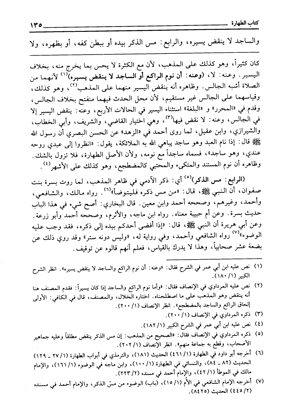 ـــــــــــــــــــــــــــــQكَانَ كَثِيرًا، وَهُوَ كَذَلِكَ عَلَى الْمَذْهَبِ، لِأَنَّ مَعَ الْكَثْرَةِ لَا يُحِسُّ بِمَا يَخْرُجُ مِنْهُ بِخِلَافِ الْيَسِيرِ، وَعَنْهُ: لَا (وَعَنْهُ: أَنَّ نَوْمَ الرَّاكِعِ أَوِ السَّاجِدِ لَا يَنْقُضُ يَسِيرُهُ) لِأَنَّهُمَا مِنَ الصَّلَاةِ أَشْبَهَ الْجَالِسَ، وَظَاهِرُهُ أَنَّهُ يَنْقُضُ الْيَسِيرُ مِنْهُمَا عَلَى الْمَذْهَبِ، وَهُوَ كَذَلِكَ، وَقِيَاسُهُمَا عَلَى الْجَالِسِ غَيْرُ مُسْتَقِيمٍ، لِأَنَّ مَحَلَّ الْحَدَثِ فِيهِمَا مُنْفَتِحٌ بِخِلَافِ الْجَالِسِ، وَقَدَّمَ فِي " الْمُحَرَّرِ "، و" الْبُلْغَةِ " اسْتِثْنَاءَ الْيَسِيرِ فِي الْحَالَاتِ الْأَرْبَعِ، وَعَنْهُ: يَنْقُضُ الْيَسِيرُ إِلَّا فِي الْجَالِسِ، وَعَنْهُ: لَا نَقْضَ فِيهَا، وَهِيَ اخْتِيَارُ الْقَاضِي، وَالشَّرِيفِ، وَأَبِي الْخَطَّابِ، وَالشِّيرَازِيِّ، وَابْنِ عَقِيلٍ، لِمَا رَوَى أَحْمَدُ فِي الزُّهْدِ عَنِ الْحَسَنِ الْبَصْرِيِّ: أَنَّ رَسُولَ اللَّهِ - صَلَّى اللَّهُ عَلَيْهِ وَسَلَّمَ - قَالَ: «إِذَا نَامَ الْعَبْدُ وَهُوَ سَاجِدٌ، يُبَاهِي اللَّهُ بِهِ الْمَلَائِكَةَ، يَقُولُ: انْظُرُوا إِلَى عَبْدِي رُوحُهُ عِنْدِي، وَهُوَ سَاجِدٌ» فَسَمَّاهُ سَاجِدًا مَعَ نَوْمِهِ، وَلِأَنَّ الْأَصْلَ الطَّهَارَةُ، فَلَا تَزُولُ بِالشَّكِّ، وَظَاهِرُهُ أَنَّ نَوْمَ الْمُسْتَنِدِ، وَالْمُتَّكِئِ، وَالْمُحْتَبِي كَالْمُضْطَجِعِ، وَهُوَ كَذَلِكَ عَلَى الْأَشْهَرِ.