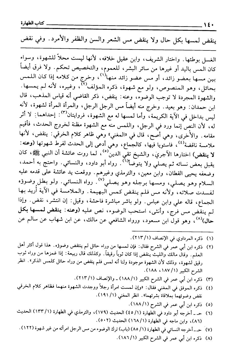 ـــــــــــــــــــــــــــــQالْغُسْلُ بِوَطْئِهَا، وَاخْتَارَ الشَّرِيفُ، وَابْنُ عَقِيلٍ خِلَافَهُ، لِأَنَّهَا لَيْسَتْ مَحَلًّا لِلشَّهْوَةِ، وَسَوَاءٌ كَانَ الْمَسُّ بِالْيَدِ، أَوْ غَيْرِهَا مِنْ سَائِرِ الْبَشَرِ لِلْعُمُومِ، وَالتَّخْصِيصُ تَحَكُّمٌ، وَلَا فَرْقَ أَيْضًا بَيْنَ مَسِّهَا بِعُضْوٍ زَائِدٍ أَوْ مَسِّ عُضْوٍ زَائِدٍ مِنْهَا، وَخَرَجَ مِنْ كَلَامِهِ إِذَا كَانَ اللَّمْسُ بِحَائِلٍ، وَهُوَ الْمَنْصُوصُ، وَلَوْ مَعَ شَهْوَةٍ، ذَكَرَهُ الْمُؤَلِّفُ وَغَيْرُهُ، لِأَنَّهُ لَمْ يَمَسَّهَا، وَالشَّهْوَةُ الْمُجَرَّدَةُ لَا تُوجِبُ الْوُضُوءَ، وَعَنْهُ: يَنْقُضُ، ذَكَرَ الْقَاضِي أَنَّهُ قِيَاسُ الْمَذْهَبِ، قَالَ ابْنُ حَمْدَانَ: وَهُوَ بَعِيدٌ، وَخَرَجَ مِنْهُ أَيْضًا مَسُّ الرَّجُلِ الرَّجُلَ، وَالْمَرْأَةِ الْمَرْأَةَ لِشَهْوَةٍ، لِأَنَّهُ لَيْسَ بِدَاخِلٍ فِي الْآيَةِ الْكَرِيمَةِ، وَأَمَّا لَمْسُهَا لَهُ مَعَ الشَّهْوَةِ، فَرِوَايَتَانِ: إِحْدَاهُمَا لَا أَثَرَ لَهُ، لِأَنَّ النَّصَّ إِنَّمَا وَرَدَ فِي الرَّجُلِ، وَاللَّمْسُ مِنْهُ مَعَ الشَّهْوَةِ مَظِنَّةٌ لِخُرُوجِ الْحَدَثِ فَأُقِيمَ مَقَامَهُ، وَالْأُخْرَى، وَهِيَ أَصَحُّ، قَالَ فِي " الْمُغْنِي ": وَهِيَ ظَاهِرُ كَلَامِ الْخِرَقِيِّ: يَنْقُضُ، لِأَنَّهَا مُلَامَسَةٌ نَاقِضَةٌ، فَاسْتَوَيَا فِيهَا كَالْجِمَاعِ، وَهِيَ أَدْعَى إِلَى الْحَدَثِ لِفَرْطِ شَهْوَتِهَا (وَعَنْهُ: لَا يَنْقُضُ) اخْتَارَهَا الْآجُرِّيُّ، وَالشَّيْخُ تَقِيُّ الدِّينِ لِمَا رَوَتْ عَائِشَةُ: «أَنَّ النَّبِيَّ - صَلَّى اللَّهُ عَلَيْهِ وَسَلَّمَ - كَانَ يُقَبِّلُ بَعْضَ نِسَائِهِ، ثُمَّ يُصَلِّي، وَلَا يَتَوَضَّأُ» رَوَاهُ أَبُو دَاوُدَ، وَالنَّسَائِيُّ، وَاحْتَجَّ بِهِ أَحْمَدُ، وَضَعَّفَهُ يَحْيَى الْقَطَّانُ، وَابْنُ مَعِينٍ، وَالتِّرْمِذِيُّ، وَغَيْرُهُمْ، «وَوَقَعَتْ يَدُ عَائِشَةَ عَلَى قَدَمِهِ - عَلَيْهِ السَّلَامُ -، وَهُوَ يُصَلِّي، وَمَسَّهَا بِرِجْلِهِ، وَهُوَ يُصَلِّي» رَوَاهُ النَّسَائِيُّ، وَلَوْ بَطَلَ وُضُوءُهُ لَفَسَدَتْ صَلَاتُهُ، وَلِأَنَّهُ مَسَّ فَلَمْ يَنْقُضْ كَمَسِّ الْبَهِيمَةِ، وَالْمُلَامَسَةُ فِي الْآيَةِ أُرِيدَ بِهَا الْجِمَاعُ، قَالَهُ عَلِيٌّ، وَابْنُ عَبَّاسٍ، وَلَوْ بَاشَرَ مُبَاشَرَةً فَاحِشَةً، وَقِيلَ: إِنِ انْتَشَرَ نَقَضَ، وَإِذَا لَمْ يَنْقُضْ مَسُّ فَرْجٍ، وَأُنْثَى، اسْتُحِبَّ الْوُضُوءُ، نَصَّ عَلَيْهِ (وَعَنْهُ: يَنْقُضُ لَمْسُهَا بِكُلِّ حَالٍ) وَهُوَ قَوْلُ ابْنُ مَسْعُودٍ، وَرَوَاهُ الشَّافِعِيُّ، عَنْ مَالِكٍ، عَنِ ابْنِ شِهَابٍ، عَنْ سَالِمٍ، عَنْ