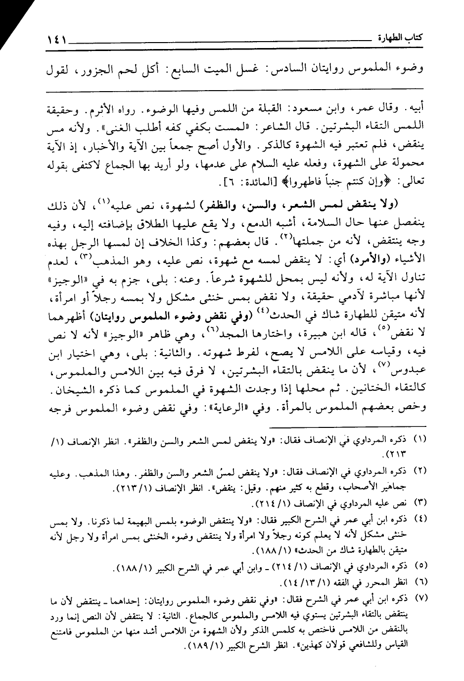 (وَلَا يَنْقُضُ لَمْسُ الشَّعَرِ، وَالسِّنِّ، وَالظُّفُرِ) لِشَهْوَةٍ، نَصَّ عَلَيْهِ، لِأَنَّ ذَلِكَ يَنْفَصِلُ عَنْهَا حَالَ السَّلَامَةِ، أَشْبَهَ الدَّمْعَ، وَلَا يَقَعُ عَلَيْهَا الطَّلَاقُ بِإِضَافَتِهِ إِلَيْهِ، وَفِيهِ وَجْهٌ يَنْتَقِضُ، لِأَنَّهُ مِنْ جُمْلَتِهَا، قَالَ بَعْضُهُمْ: وَكَذَا الْخِلَافُ إِنْ لَمَسَهَا الرَّجُلُ بِهَذِهِ الْأَشْيَاءِ (وَالْأَمْرَدِ) أَيْ: لَا يَنْقُضُ لَمْسُهُ مَعَ شَهْوَةٍ، نَصَّ عَلَيْهِ، وَهُوَ الْمَذْهَبُ لِعَدَمِ تَنَاوُلِ الْآيَةِ لَهُ، وَلِأَنَّهُ لَيْسَ بِمَحَلٍّ لِلشَّهْوَةِ شَرْعًا، وَعَنْهُ: بَلَى، جَزَمَ بِهِ فِي " الْوَجِيزِ " لِأَنَّهَا مُبَاشَرَةٌ لِآدَمِيٍّ حَقِيقَةً، وَلَا نَقْضَ بِمَسِّ خُنْثَى مُشْكِلٍ، وَلَا بِمَسِّهِ رَجُلًا أَوْ امْرَأَةً، لِأَنَّهُ مُتَيَقِّنٌ لِلطَّهَارَةِ شَاكٌّ فِي الْحَدَثِ (وَفِي نَقْضِ وُضُوءِ الْمَلْمُوسِ رِوَايَتَانِ) أَظْهَرُهُمَا لَا نَقْضَ، قَالَهُ ابْنُ هُبَيْرَةَ، وَاخْتَارَهَا الْمَجْدُ، وَهِيَ ظَاهِرُ " الْوَجِيزِ " لِأَنَّهُ لَا نَصَّ فِيهِ، وَقِيَاسُهُ عَلَى اللَّامِسِ لَا يَصِحُّ لِفَرْطِ شَهْوَتِهِ، وَالثَّانِيَةُ: بَلَى، وَهِيَ اخْتِيَارُ ابْنِ عَبْدُوسٍ، لِأَنَّ مَا يُنْقَضُ بِالْتِقَاءِ الْبَشَرَتَيْنِ لَا فَرْقَ فِيهِ بَيْنَ اللَّامِسِ وَالْمَلْمُوسِ، كَالْتِقَاءِ الْخِتَانَيْنِ، ثُمَّ مَحَلُّهَا إِذَا وُجِدَتِ الشَّهْوَةُ فِي الْمَلْمُوسِ كَمَا ذَكَرَهُ الشَّيْخَانِ، وَخَصَّ بَعْضُهُمُ الْمَلْمُوسَ بِالْمَرْأَةِ، وَفِي " الرِّعَايَةِ " وَفِي نَقْضِ وُضُوءِ الْمَلْمُوسِ فَرْجُهُ