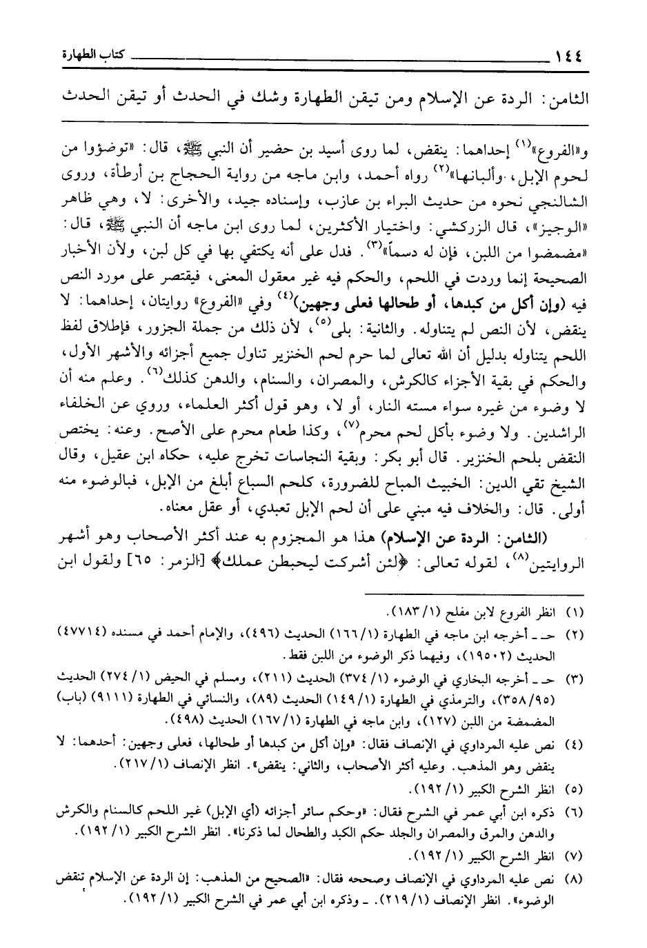 الثَّامِنُ: الرِّدَّةُ عَنِ الْإِسْلَامِ. وَمَنْ تَيَقَّنَ الطَّهَارَةَ، وَشَكَّ فِي الْحَدَثِ، أَوْ تَيَقَّنَ الْحَدَثَ