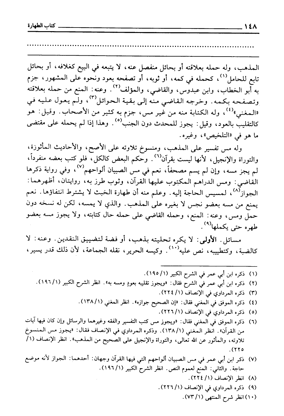 ـــــــــــــــــــــــــــــQالْمَذْهَبِ، وَلَهُ حَمْلُهُ بِعَلَاقَتِهِ، أَوْ بِحَائِلٍ مُنْفَصِلٍ عَنْهُ، لَا يَتْبَعُهُ فِي الْبَيْعِ كَغِلَافِهِ، أَوْ بِحَائِلٍ تَابِعٍ لِلْحَامِلِ، كَحَمْلِهِ فِي كُمِّهِ، أَوْ ثَوْبِهِ، أَوْ تَصَفُّحِهِ بِعُودٍ، وَنَحْوِهِ عَلَى الْمَشْهُورِ، جَزَمَ بِهِ أَبُو الْخَطَّابِ، وَابْنُ عَبْدُوسٍ وَالْقَاضِي، وَالْمُؤَلِّفُ، وَعَنْهُ: الْمَنْعُ مِنْ حَمْلِهِ بِعَلَاقَتِهِ، وَتَصَفُّحِهِ بِكُمِّهِ، وَخَرَّجَهُ الْقَاضِي مِنْهُ إِلَى بَقِيَّةِ الْحَوَائِلِ، وَلَمْ يُعَوَّلْ عَلَيْهِ فِي " الْمُغْنِي "، وَلَهُ الْكِتَابَةُ مِنْهُ مِنْ غَيْرِ مَسٍّ، جَزَمَ بِهِ كَثِيرٌ مِنَ الْأَصْحَابِ، وَقِيلَ: هُوَ كَالتَّقْلِيبِ بِالْعُودِ، وَقِيلَ: يَجُوزُ لِلْمُحْدِثِ دُونَ الْجُنُبِ، وَهَذَا إِذَا لَمْ يَحْمِلْهُ عَلَى مُقْتَضَى مَا هُوَ فِي " التَّلْخِيصِ " وَغَيْرِهِ.