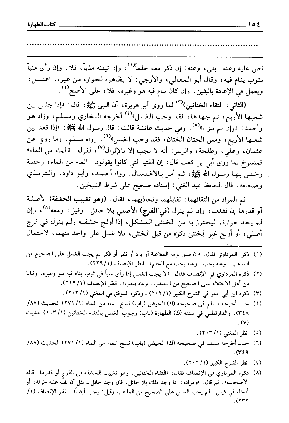 (الثَّانِي: الْتِقَاءُ الْخِتَانَيْنِ) لِمَا رَوَى أَبُو هُرَيْرَةَ أَنَّ النَّبِيَّ - صَلَّى اللَّهُ عَلَيْهِ وَسَلَّمَ - قَالَ: «إِذَا جَلَسَ بَيْنَ شُعَبِهَا الْأَرْبَعِ، ثُمَّ جَهَدَهَا، فَقَدْ وَجَبَ الْغُسْلُ» أَخْرَجَهُ الْبُخَارِيُّ، وَمُسْلِمٌ، وَزَادَ هُوَ، وَأَحْمَدُ «وَإِنْ لَمْ يُنْزِلْ» وَفِي حَدِيثِ عَائِشَةَ قَالَتْ: قَالَ رَسُولُ اللَّهِ - صَلَّى اللَّهُ عَلَيْهِ وَسَلَّمَ -: «إِذَا قَعَدَ بَيْنَ شُعَبِهَا الْأَرْبَعِ، وَمَسَّ الْخِتَانُ الْخِتَانَ، فَقَدْ وَجَبَ الْغُسْلُ» رَوَاهُ مُسْلِمٌ، وَمَا رُوِيَ عَنْ عُثْمَانَ، وَعَلِيٍّ، وَطَلْحَةَ، وَالزُّبَيْرِ أَنَّهُ لَا يَجِبُ إِلَّا بِالْإِنْزَالِ، لِقَوْلِهِ: «الْمَاءُ مِنَ الْمَاءِ» . فَمَنْسُوخٌ بِمَا رَوَى أُبَيُّ بْنُ كَعْبٍ «قَالَ: إِنَّ الْفُتْيَا الَّتِي كَانُوا يَقُولُونَ: الْمَاءُ مِنَ الْمَاءِ، رُخْصَةٌ رَخَّصَ بِهَا رَسُولُ اللَّهِ - صَلَّى اللَّهُ عَلَيْهِ وَسَلَّمَ - ثُمَّ أَمَرَ بِالِاغْتِسَالِ» رَوَاهُ أَحْمَدُ، وَأَبُو دَاوُدَ، وَالتِّرْمِذِيُّ، وَصَحَّحَهُ. قَالَ الْحَافِظُ عَبْدُ الْغَنِيِّ: إِسْنَادُهُ صَحِيحٌ عَلَى شَرْطِ الشَّيْخَيْنِ.