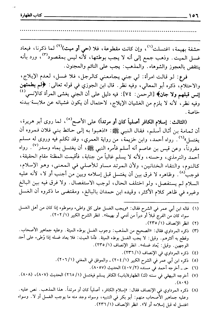 (الثَّالِثُ: إِسْلَامُ الْكَافِرِ أَصْلِيًّا كَانَ أَوْ مُرْتَدًّا) عَلَى الْأَصَحِّ، لِمَا رَوَى أَبُو هُرَيْرَةَ: «أَنَّ ثُمَامَةَ بْنَ أَثَالٍ أَسْلَمَ، فَقَالَ النَّبِيُّ - صَلَّى اللَّهُ عَلَيْهِ وَسَلَّمَ -: اذْهَبُوا بِهِ إِلَى حَائِطِ بَنِي فُلَانٍ فَمُرُوهُ أَنْ يَغْتَسِلَ» رَوَاهُ أَحْمَدُ، وَابْنُ خُزَيْمَةَ مِنْ رِوَايَةِ الْعَمْرِيِّ، وَقَدْ تُكُلِّمَ فِيهِ وَرَوَى لَهُ مُسْلِمٌ مَقْرُونًا، وَعَنْ قَيْسِ بْنِ عَاصِمٍ: «أَنَّهُ أَسْلَمَ فَأَمَرَهُ النَّبِيُّ - صَلَّى اللَّهُ عَلَيْهِ وَسَلَّمَ - أَنْ يَغْتَسِلَ بِمَاءٍ وَسِدْرٍ» رَوَاهُ أَحْمَدُ، وَالتِّرْمِذِيُّ، وَحَسَّنَهُ، وَلِأَنَّهُ لَا يَسْلَمُ غَالِبًا مِنْ جَنَابَةٍ، فَأُقِيمَتِ الْمَظِنَّةُ مُقَامَ الْحَقِيقَةِ كَالنَّوْمِ، وَالْتِقَاءِ الْخِتَانَيْنِ، وَلِأَنَّ الْمُرْتَدَّ مُسَاوٍ لِلْأَصْلِيِّ فِي الْمَعْنَى، وَهُوَ الْإِسْلَامُ فَوَجَبَ، وَظَاهِرُهُ لَا فَرْقَ بَيْنَ أَنْ يَغْتَسِلَ قَبْلَ إِسْلَامِهِ، وَبَيْنَ مَنْ أَجْنَبَ أَوْ لَا، لِأَنَّهُ - عَلَيْهِ السَّلَامُ - لَمْ يَسْتَفْصِلْ، وَلَوِ اخْتَلَفَ الْحَالُ لَوَجَبَ الِاسْتِفْصَالُ، وَلَا فَرْقَ فِيهِ بَيْنَ الْبَالِغِ وَغَيْرِهِ فِي ظَاهِرِ كَلَامِ الْأَكْثَرِ، وَقَيَّدَهُ ابْنُ حَمْدَانَ بِالْبَالِغِ، وَمُقْتَضَى مَا ذَكَرُوهُ أَنَّ الْغُسْلَ