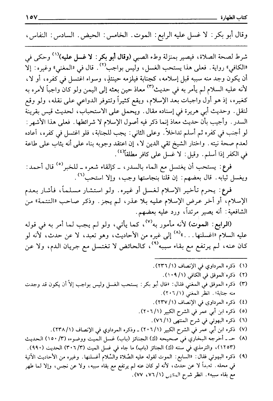 ـــــــــــــــــــــــــــــQشَرْطٌ لِصِحَّةِ الصَّلَاةِ فَيَصِيرُ بِمَنْزِلَةِ وَطْءِ الصَّبِيِّ (وَقَالَ أَبُو بَكْرٍ: لَا غُسْلَ عَلَيْهِ) وَحَكَى فِي " الْكَافِي " رِوَايَةً. فَعَلَى هَذَا يُسْتَحَبُّ الْغُسْلُ، وَلَيْسَ بِوَاجِبٍ، قَالَ فِي " الْمُغْنِي " وَغَيْرِهِ: إِلَّا أَنْ يَكُونَ وُجِدَ مِنْهُ سَبَبُهُ قَبْلَ إِسْلَامِهِ كَجَنَابَةٍ، فَيَلْزَمُهُ حِينَئِذٍ، وَسَوَاءٌ اغْتَسَلَ فِي كُفْرِهِ أَوْ لَا، لِأَنَّهُ - عَلَيْهِ السَّلَامُ - لَمْ يَأْمُرْ بِهِ فِي حَدِيثِ مُعَاذٍ حِينَ بَعَثَهُ إِلَى الْيَمَنِ، وَلَوْ كَانَ وَاجِبًا لَأَمَرَ بِهِ كَغَيْرِهِ، إِذْ هُوَ أَوَّلُ وَاجِبَاتِ بَعْدِ الْإِسْلَامِ، وَيَقَعُ كَثِيرًا، وَتَتَوَفَّرُ الدَّوَاعِي عَلَى نَقْلِهِ، وَلَوْ وَقَعَ لَنُقِلَ، وَحَدِيثُ أَبِي هُرَيْرَةَ فِي إِسْنَادِهِ مَقَالٌ، وَيُحْمَلُ عَلَى الِاسْتِحْبَابِ، لِحَدِيثِ قَيْسٍ بِقَرِينَةِ السِّدْرِ، وَأُجِيبَ بِأَنَّ حَدِيثَ مُعَاذٍ إِنَّمَا ذَكَرَ فِيهِ أُصُولَ الْإِسْلَامِ لَا شَرَائِطَهَا، فَعَلَى هَذَا، الْأَشْهَرُ: لَوْ أَجْنَبَ فِي كُفْرِهِ ثُمَّ أَسْلَمَ تَدَاخَلَا، وَعَلَى الثَّانِي: يَجِبُ لِلْجَنَابَةِ، فَلَوِ اغْتَسَلَ فِي كُفْرِهِ أَعَادَهُ لِعَدَمِ صِحَّةِ نِيَّتِهِ، وَاخْتَارَ الشَّيْخُ تَقِيُّ الدِّينِ لَا، إِنِ اعْتَقَدَ وَجُوبَهَ، بِنَاءً عَلَى أَنَّهُ يُثَابُ عَلَى طَاعَةٍ فِي الْكُفْرِ إِذَا أَسْلَمَ، وَقِيلَ: لَا غُسْلَ عَلَى كَافِرٍ مُطْلَقًا.