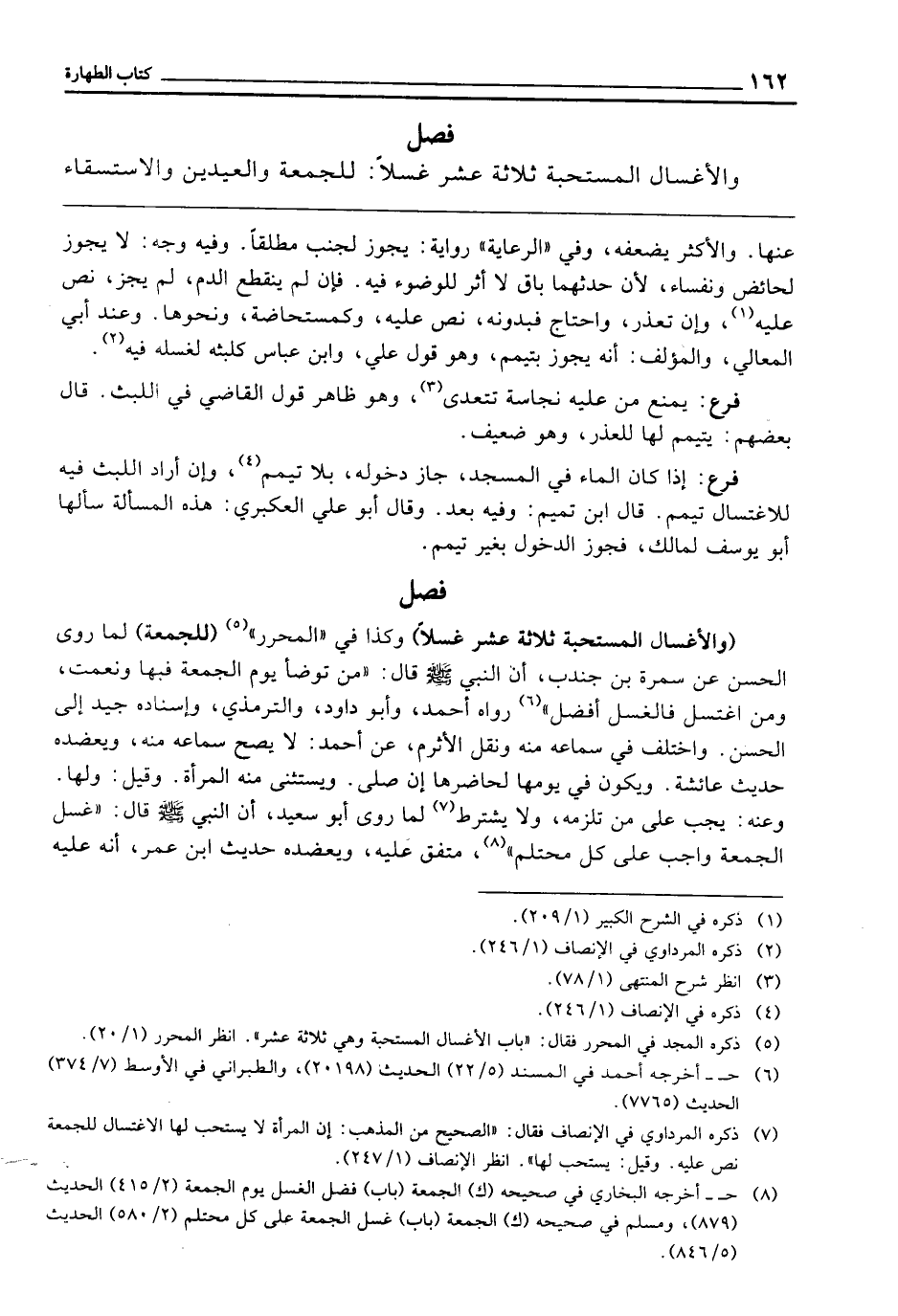 وَكَذَا فِي " الْمُحَرَّرِ " (لِلْجُمُعَةِ) لِمَا رَوَى الْحَسَنُ عَنْ سَمُرَةَ بْنِ جُنْدَبٍ أَنَّ النَّبِيَّ - صَلَّى اللَّهُ عَلَيْهِ وَسَلَّمَ - قَالَ: «مَنْ تَوَضَّأَ يَوْمَ الْجُمُعَةَ فَبِهَا وَنِعْمَتْ، وَمَنِ اغْتَسَلَ فَالْغُسْلُ أَفْضَلُ» رَوَاهُ أَحْمَدُ، وَأَبُو دَاوُدَ، وَالتِّرْمِذِيُّ، وَإِسْنَادُهُ جَيِّدٌ إِلَى الْحَسَنِ، وَاخْتُلِفَ فِي سَمَاعِهِ مِنْهُ، وَنَقَلَ الْأَثْرَمُ عَنْ أَحْمَدَ: لَا يَصِحُّ سَمَاعُهُ مِنْهُ، وَيُعَضِّدُهُ حَدِيثُ عَائِشَةَ، وَيَكُونُ فِي يَوْمِهَا لِحَاضِرِهَا إِنْ صَلَّى، وَيُسْتَثْنَى مِنْهُ الْمَرْأَةُ، وَقِيلَ: وَلَهَا، وَعَنْهُ: يَجِبُ عَلَى مَنْ تَلْزَمُهُ، وَلَا يُشْتَرَطُ لِمَا رَوَى أَبُو سَعِيدٍ أَنَّ النَّبِيَّ - صَلَّى اللَّهُ عَلَيْهِ وَسَلَّمَ - قَالَ: «غُسْلُ الْجُمُعَةِ وَاجِبٌ عَلَى كُلِّ مُحْتَلِمٍ» مُتَّفَقٌ عَلَيْهِ. وَيُعَضِّدُهُ حَدِيثُ ابْنِ عُمَرَ أَنَّهُ عَلَيْهِ