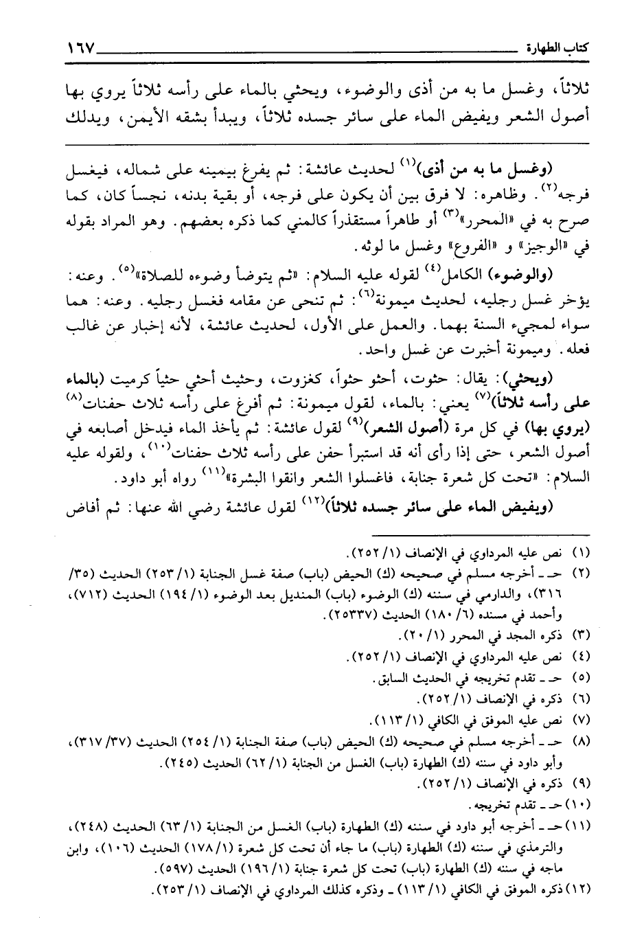 (وَالْوُضُوءُ) الْكَامِلُ لِقَوْلِهِ - عَلَيْهِ السَّلَامُ -: «ثُمَّ يَتَوَضَّأُ وُضُوءَهُ لِلصَّلَاةِ» وَعَنْهُ: يُؤَخِّرُ غَسْلَ رِجْلَيْهِ لِحَدِيثِ مَيْمُونَةَ: «ثُمَّ تَنَحَّى عَنْ مَقَامِهِ فَغَسَلَ رِجْلَيْهِ» وَعَنْهُ: هُمَا سَوَاءٌ لِمَجِيءِ السُّنَّةِ بِهِمَا، وَالْعَمَلُ عَلَى الْأَوَّلِ، لِحَدِيثِ عَائِشَةَ، لِأَنَّهُ إِخْبَارٌ عَنْ غَالِبِ فِعْلِهِ، وَمَيْمُونَةُ أَخْبَرَتْ عَنْ غُسْلٍ وَاحِدٍ.