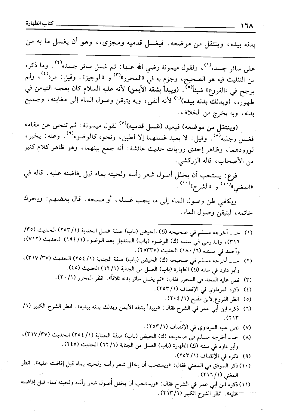 (وَيَنْتَقِلُ مِنْ مَوْضِعِهِ) فَيُعِيدُ (غَسْلَ قَدَمَيْهِ) لِقَوْلِ مَيْمُونَةَ: «ثُمَّ تَنَحَّى عَنْ مَقَامِهِ فَغَسَلَ رِجْلَيْهِ» وَقِيلَ: لَا يُعِيدُ غَسْلَهُمَا إِلَّا لِطِينٍ، وَنَحْوِهِ كَالْوُضُوءِ، وَعَنْهُ: يُخَيَّرُ لِوُرُودِهِمَا، وَظَاهِرُ إِحْدَى رِوَايَاتِ حَدِيثِ عَائِشَةَ: أَنَّهُ جَمَعَ بَيْنَهُمَا، وَهُوَ ظَاهِرُ كَلَامِ كَثِيرٍ مِنَ الْأَصْحَابِ، قَالَهُ الزَّرْكَشِيُّ.