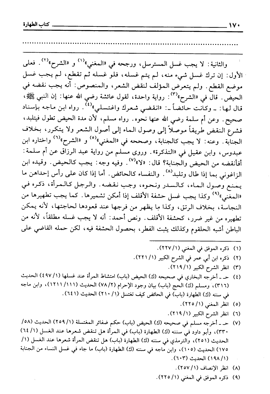 ـــــــــــــــــــــــــــــQوَالثَّانِيَةُ: لَا يَجِبُ غَسْلُ الْمُسْتَرْسِلِ، وَرَجَّحَهُ فِي " الْمُغْنِي " و" الشَّرْحِ " فَعَلَى الْأَوَّلِ: إِنْ تَرَكَ غَسْلَ شَيْءٍ مِنْهُ لَمْ يَتِمَّ غُسْلُهُ، فَلَوْ غَسَلَهُ ثُمَّ تَقَطَّعَ لَمْ يَجِبْ غَسْلُ مَوْضِعِ الْقَطْعِ، وَلَمْ يَتَعَرَّضِ الْمُؤَلِّفُ لِنَقْضِ الشَّعْرِ، وَالْمَنْصُوصُ: أَنَّهُ يَجِبُ نَقْضُهُ فِي الْحَيْضِ، قَالَ فِي " الشَّرْحِ ": رِوَايَةٌ وَاحِدَةٌ لِقَوْلِ عَائِشَةَ - رَضِيَ اللَّهُ عَنْهَا -: «إِنَّ النَّبِيَّ - صَلَّى اللَّهُ عَلَيْهِ وَسَلَّمَ - قَالَ لَهَا - وَكَانَتْ حَائِضًا - انْقُضِي شَعْرَكِ، وَاغْتَسِلِي» .