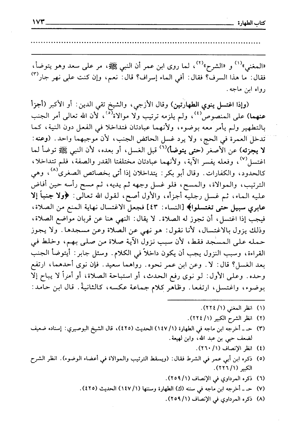 ـــــــــــــــــــــــــــــQ" الْمُغْنِي " و" الشَّرْحِ " لِمَا رَوَى ابْنُ عُمَرَ: «أَنَّ النَّبِيَّ - صَلَّى اللَّهُ عَلَيْهِ وَسَلَّمَ - مَرَّ عَلَى سَعْدٍ، وَهُوَ يَتَوَضَّأُ فَقَالَ: مَا هَذَا السَّرَفُ؛ فَقَالَ: أَفِي الْمَاءِ إِسْرَافٌ؛ قَالَ: نَعَمْ، وَإِنْ كُنْتَ عَلَى نَهْرٍ جَارٍ» رَوَاهُ ابْنُ مَاجَهْ.