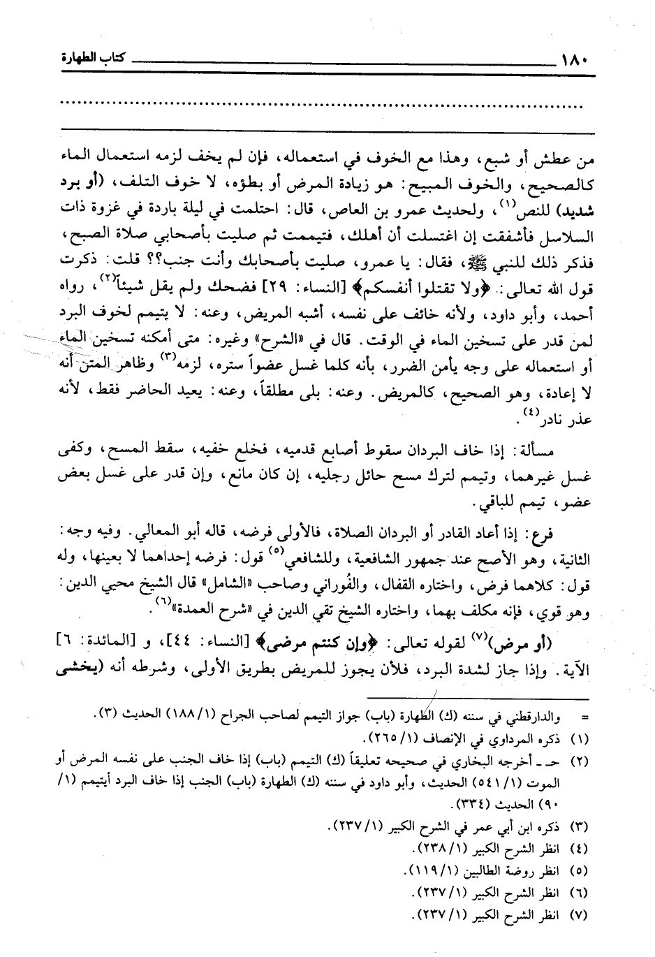 ـــــــــــــــــــــــــــــQمِنْ عَطَشٍ أَوْ شِبَعٍ، وَهَذَا مَعَ الْخَوْفِ فِي اسْتِعْمَالِهِ، فَإِنْ لَمْ يَخَفْ لَزِمَهُ اسْتِعْمَالُ الْمَاءِ كَالصَّحِيحِ، وَالْخَوْفُ الْمُبِيحُ: هُوَ زِيَادَةُ الْمَرَضِ أَوْ بُطْؤُهُ، لَا خَوْفُ التَّلَفِ (أَوْ بَرْدٌ شَدِيدٌ) لِلنَّصِّ، وَلِحَدِيثِ عَمْرِو بْنِ الْعَاصِ قَالَ: «احْتَلَمْتُ فِي لَيْلَةٍ بَارِدَةٍ، فِي غَزْوَةِ ذَاتِ السَّلَاسِلِ، فَأَشْفَقْتُ إِنِ اغْتَسَلْتُ أَنْ أَهْلِكَ، فَتَيَمَّمْتُ، ثُمَّ صَلَّيْتُ بِأَصْحَابِي صَلَاةَ الصُّبْحِ، فَذُكِرَ ذَلِكَ لِلنَّبِيِّ - صَلَّى اللَّهُ عَلَيْهِ وَسَلَّمَ - فَقَالَ: يَا عَمْرُو صَلَّيْتَ بِأَصْحَابِكَ وَأَنْتَ جُنُبٌ، قُلْتُ: ذَكَرْتُ قَوْلَ اللَّهِ تَعَالَى {وَلا تَقْتُلُوا أَنْفُسَكُمْ} [النساء: 29] فَضَحِكَ، وَلَمْ يَقُلْ شَيْئًا» رَوَاهُ أَحْمَدُ، وَأَبُو دَاوُدَ، وَلِأَنَّهُ خَائِفٌ عَلَى نَفْسِهِ أَشْبَهَ الْمَرِيضَ، وَعَنْهُ: لَا يَتَيَمَّمُ لِخَوْفِ الْبَرْدِ لِمَنْ قَدَرَ عَلَى تَسْخِينِ الْمَاءِ فِي الْوَقْتِ، قَالَ فِي " الشَّرْحِ " وَغَيْرِهِ: مَتَى أَمْكَنَهُ تَسْخِينُ الْمَاءِ أَوِ اسْتِعْمَالُهُ عَلَى وَجْهٍ يَأْمَنُ الضَّرَرَ، بِأَنَّهُ كُلَّمَا غَسَلَ عُضْوًا سَتَرَهُ لَزِمَهُ، وَظَاهِرُ الْمَتْنِ أَنَّهُ لَا إِعَادَةَ، وَهُوَ الصَّحِيحُ كَالْمَرِيضِ، وَعَنْهُ: بَلَى مُطْلَقًا، وَعَنْهُ: يُعِيدُ الْحَاضِرُ فَقَطْ، لِأَنَّهُ عُذْرٌ نَادِرٌ.