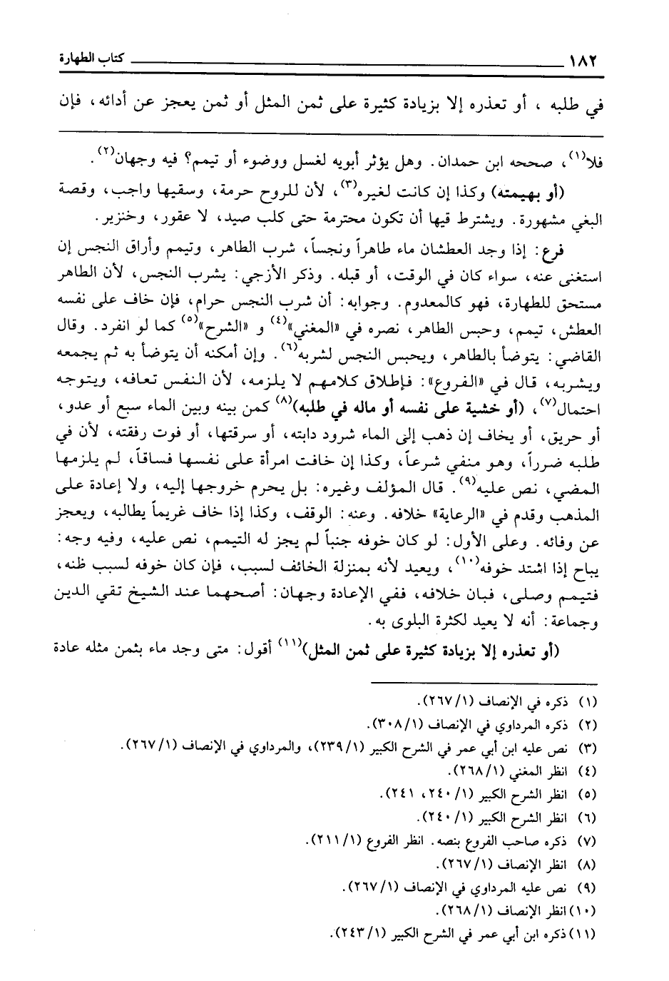 فِي طَلَبِهِ أَوْ تَعَذُّرِهِ إِلَّا بِزِيَادَةٍ كَثِيرَةٍ عَلَى ثَمَنِ الْمِثْلِ أَوْ ثَمَنٍ يَعْجِزُ عَنْ أَدَائِهِ، فَإِنْ