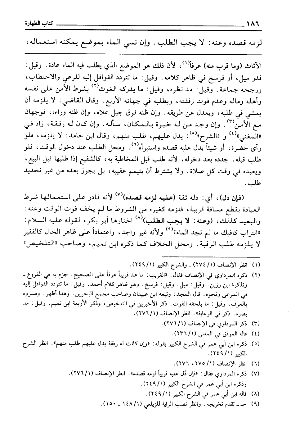 ـــــــــــــــــــــــــــــQالْأَثَاثِ (وَمَا قَرُبَ مِنْهُ) عُرْفًا، لِأَنَّ ذَلِكَ هُوَ الْمَوْضِعُ الَّذِي يُطْلَبُ فِيهِ الْمَاءُ عَادَةً، وَقِيلَ: قَدْرَ مِيلٍ أَوْ فَرْسَخٍ فِي ظَاهِرِ كَلَامِهِ، وَقِيلَ: مَا تَتَرَدَّدُ الْقَوَافِلُ إِلَيْهِ لِلرَّعْيِ وَالِاحْتِطَابِ، وَرَجَّحَهُ جَمَاعَةٌ، وَقِيلَ: مَدَّ نَظَرِهِ، وَقِيلَ: مَا يُدْرِكُهُ الْغَوْثُ بِشَرْطِ الْأَمْنِ عَلَى نَفْسِهِ وَأَهْلِهِ وَمَالِهِ، وَعَدَمِ فَوْتِ رُفْقَتِهِ، وَيَطْلُبُهُ فِي جِهَاتِهِ الْأَرْبَعِ، وَقَالَ الْقَاضِي: لَا يَلْزَمُهُ أَنْ يَمْشِيَ فِي طَلَبِهِ، وَيَعْدِلَ عَنْ طَرِيقِهِ، وَإِنْ ظَنَّهُ فَوْقَ جَبَلٍ عَلَاهُ، وَإِنْ ظَنَّهُ وَرَاءَهُ، فَوَجْهَانِ مَعَ الْأَمْنِ، وَإِنْ وَجَدَ مَنْ لَهُ خِبْرَةٌ بِالْمَكَانِ سَأَلَهُ، وَإِنْ كَانَ لَهُ رُفْقَةٌ زَادَ فِي " الْمُغْنِي " و" الشَّرْحِ ": يُدَلُّ عَلَيْهِمْ، طَلَبَ مِنْهُمْ، وَقَالَ ابْنُ حَامِدٍ: لَا يَلْزَمُهُ فَلَوْ رَأَى خُضْرَةً أَوْ شَيْئًا يَدُلُّ عَلَيْهِ قَصَدَهُ وَاسْتَبْرَأَهُ، وَمَحَلُّ الطَّلَبِ عِنْدَ دُخُولِ الْوَقْتِ، فَلَوْ طَلَبَ قَبْلَهُ جَدَّدَهُ بَعْدَ دُخُولِهِ، لِأَنَّهُ طَلَبَ قَبْلَ الْمُخَاطَبَةِ بِهِ، كَالشَّفِيعِ إِذَا طَلَبَهَا قَبْلَ الْبَيْعِ، وَيُعِيدُهُ فِي وَقْتِ كُلِّ صَلَاةٍ، وَلَا يُشْتَرَطُ أَنْ يَتَيَمَّمَ عَقِيبَهُ، بَلْ يَجُوزُ بَعْدَهُ من غير تَجْدِيد طَلَبٍ.