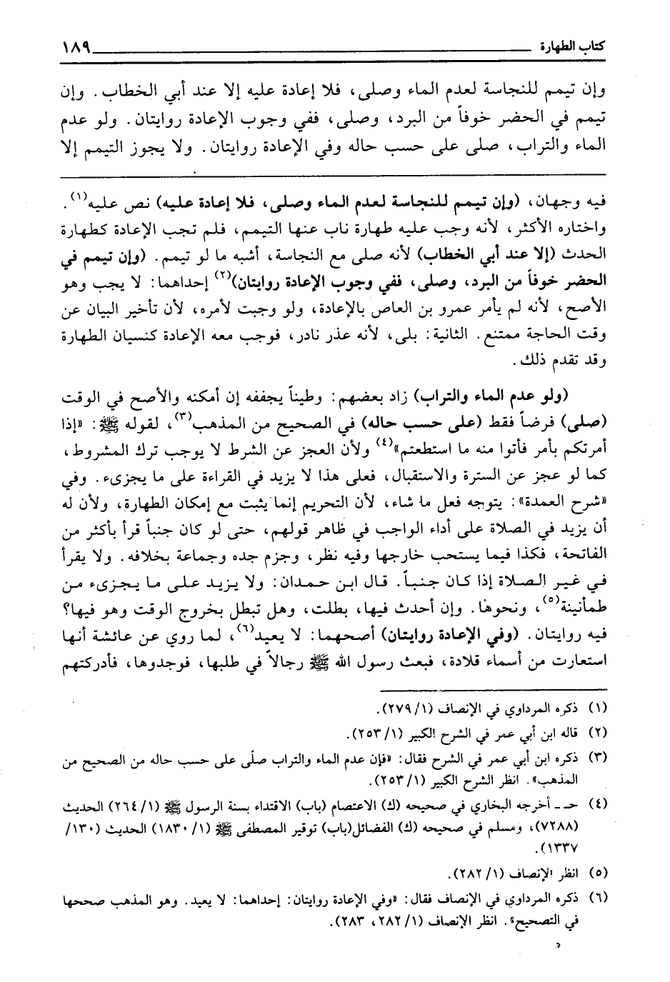ـــــــــــــــــــــــــــــQفِيهِ وَجْهَانِ (وَإِنْ تَيَمَّمَ لِلنَّجَاسَةِ لِعَدَمِ الْمَاءِ، وَصَلَّى، فَلَا إِعَادَةَ عَلَيْهِ) نَصَّ عَلَيْهِ، وَاخْتَارَهُ الْأَكْثَرُ، لِأَنَّهُ وَجَبَ عَلَيْهِ طَهَارَةٌ نَابَ عَنْهَا التَّيَمُّمُ، فَلَمْ تَجِبِ الْإِعَادَةُ، كَطَهَارَةِ الْحَدَثِ (إِلَّا عِنْدَ أَبِي الْخَطَّابِ) لِأَنَّهُ صَلَّى مَعَ النَّجَاسَةِ، أَشْبَهَ مَا لَوْ تَيَمَّمَ (وَإِنْ تَيَمَّمَ فِي الْحَضَرِ خَوْفًا مِنَ الْبَرْدِ، وَصَلَّى، فَفِي وُجُوبِ الْإِعَادَةِ رِوَايَتَانِ) إِحْدَاهُمَا: لَا يَجِبُ، وَهُوَ الْأَصَحُّ، لِأَنَّهُ لَمْ يَأْمُرْ عَمْرَو بْنَ الْعَاصِ بِالْإِعَادَةِ، وَلَوْ وَجَبَتْ لَأَمَرَهَ، لِأَنَّ تَأْخِيرَ الْبَيَانِ عَنْ وَقْتِ الْحَاجَةِ مُمْتَنِعٌ، الثَّانِيَةُ: بَلَى، لِأَنَّهُ عُذْرٌ نَادِرٌ، فَوَجَبَ مَعَهُ الْإِعَادَةُ كَنِسْيَانِ الطَّهَارَةِ، وَقَدْ تَقَدَّمَ ذَلِكَ.