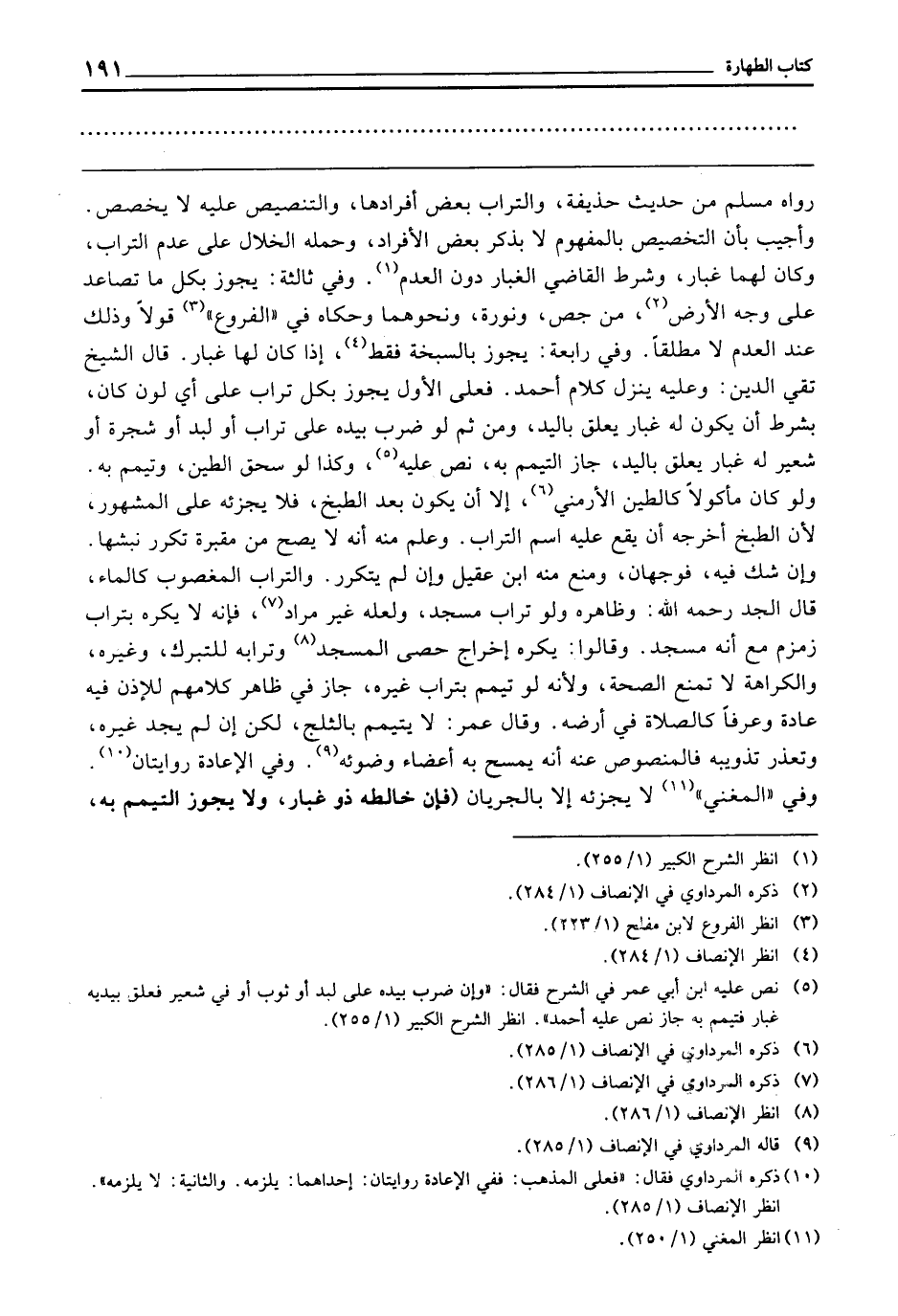 ـــــــــــــــــــــــــــــQرَوَاهُ مُسْلِمٌ مِنْ حَدِيثِ حُذَيْفَةَ، وَالتُّرَابُ بَعْضُ أَفْرَادِهَا، وَالتَّنْصِيصُ عَلَيْهِ لَا يُخَصِّصُ، وَأُجِيبَ بِأَنَّ التَّخْصِيصَ بِالْمَفْهُومِ لَا بِذِكْرِ بَعْضِ الْأَفْرَادِ، وَحَمَلَهُ الْخَلَّالُ عَلَى عَدَمِ التُّرَابِ، وَكَانَ لَهُمَا غُبَارٌ، وَشَرَطَ الْقَاضِي الْغُبَارَ دُونَ الْعَدَمِ. وَفِي ثَالِثَةٍ: يَجُوزُ بِكُلِّ مَا تَصَاعَدَ عَلَى وَجْهِ الْأَرْضِ مِنْ جِصٍّ وَنَوْرَةٍ، وَنَحْوِهِمَا، وَحَكَاهُ فِي " الْفُرُوعِ " قَوْلًا، وَذَلِكَ عِنْدَ الْعَدَمِ لَا مُطْلَقًا، وَفِي رَابِعَةٍ: يَجُوزُ بِالسَّبْخَةِ فَقَطْ إِذَا كَانَ لَهَا غُبَارٌ، قَالَ الشَّيْخُ تَقِيُّ الدِّينِ: وَعَلَيْهِ يُنَزَّلُ كَلَامُ أَحْمَدَ، فَعَلَى الْأَوَّلِ: يَجُوزُ بِكُلِّ تُرَابٍ عَلَى أَيِّ لَوْنٍ كَانَ، بِشَرْطِ أَنْ يَكُونَ لَهُ غُبَارٌ يَعْلَقُ بِالْيَدِ، وَمِنْ ثَمَّ لَوْ ضَرَبَ بِيَدِهِ عَلَى تُرَابٍ أَوْ لِبَدٍ أَوْ شَجَرَةٍ أَوْ شَعِيرٍ لَهُ غُبَارٌ يَعْلَقُ بِالْيَدِ جَازَ التَّيَمُّمُ بِهِ، نَصَّ عَلَيْهِ، وَكَذَا لَوْ سَحَقَ الطِّينَ، وَتَيَمَّمَ بِهِ، وَلَوْ كَانَ مَأْكُولًا كَالطِّينِ الْأَرْمَنِيِّ، إِلَّا أَنْ يَكُونَ بَعْدَ الطَّبْخِ، فَلَا يُجْزِئُهُ عَلَى الْمَشْهُورِ، لِأَنَّ الطَّبْخَ أَخْرَجَهُ أَنْ يَقَعَ عَلَيْهِ اسْمُ التُّرَابَ، وَعُلِمَ مِنْهُ أَنَّهُ لَا يَصِحُّ مِنْ مَقْبَرَةٍ تَكَرَّرَ نَبْشُهَا، وَإِنْ شَكَّ فِيهِ، فَوَجْهَانِ، وَمَنَعَ مِنْهُ ابْنُ عَقِيلٍ، وَإِنْ لَمْ يَتَكَرَّرْ، وَالتُّرَابُ الْمَغْصُوبُ كَالْمَاءِ. قَالَ الْمَجْدُ - رَحِمَهُ اللَّهُ -: وَظَاهِرُهُ وَلَوْ تُرَابَ مَسْجِدٍ، وَلَعَلَّهُ غَيْرُ مُرَادٍ، فَإِنَّهُ لَا يُكْرَهُ بِتُرَابِ زَمْزَمَ مَعَ أَنَّهُ مَسْجِدٌ، وَقَالُوا: يُكْرَهُ إِخْرَاجُ حَصَى الْمَسْجِدِ وَتُرَابِهِ لِلتَّبَرُّكِ وَغَيْرِهِ، وَالْكَرَاهَةُ لَا تَمْنَعُ الصِّحَّةَ، وَلِأَنَّهُ لَوْ تَيَمَّمَ بِتُرَابٍ غَيْرِهِ جَازَ فِي ظَاهِرِ كَلَامِهِمْ لِلْإِذْنِ فِيهِ عَادَةً وَعُرْفًا، كَالصَّلَاةِ فِي أَرْضِهِ، وَقَالَ عُمَرُ: لَا يَتَيَمَّمُ بِالثَّلْجِ لَكِنْ إِنْ لَمْ يَجِدْ غَيْرَهُ، وَتَعَذَّرَ تَذْوِيبُهُ فَالْمَنْصُوصُ عَنْهُ: أَنَّهُ يَمْسَحُ بِهِ أَعْضَاءَ وُضُوئِهِ، وَفِي الْإِعَادَةِ رِوَايَتَانِ، وَفِي " الْمُغْنِي " لَا يُجْزِئُهُ إِلَّا بِالْجَرَيَانِ (فَإِنْ خَالَطَهُ ذُو غُبَارٍ، وَلَا يَجُوزُ التَّيَمُّمُ بِهِ،