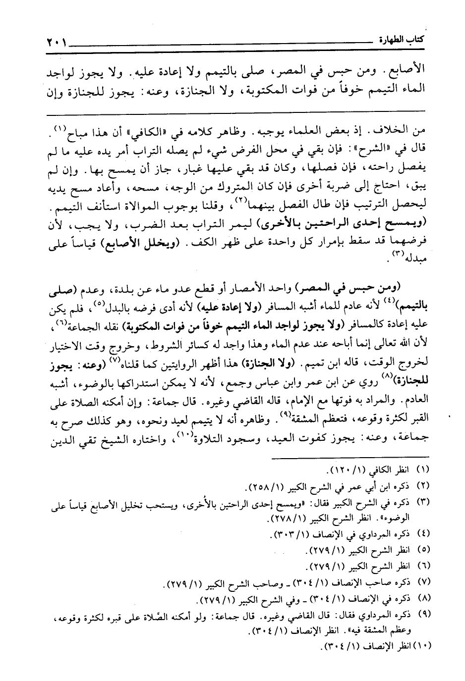 (وَمَنْ حُبِسَ فِي الْمِصْرِ) وَاحِدُ الْأَمْصَارِ أَوْ قَطَعَ عَدُوٌّ مَاءً عَنْ بَلْدَةٍ، وَعَدِمَ (صَلَّى بِالتَّيَمُّمِ) لِأَنَّهُ عَادِمٌ لِلْمَاءِ أَشْبَهَ الْمُسَافِرَ (وَلَا إِعَادَةَ عَلَيْهِ) لِأَنَّهُ أَدَّى فَرْضَهُ بِالْبَدَلِ، فَلَمْ يَكُنْ عَلَيْهِ إِعَادَةٌ كَالْمُسَافِرِ (وَلَا يَجُوزُ لِوَاجِدِ الْمَاءِ التَّيَمُّمُ خَوْفًا مِنْ فَوَاتِ الْمَكْتُوبَةِ) نَقَلَهُ الْجَمَاعَةُ، لِأَنَّ اللَّهَ تَعَالَى إِنَّمَا أَبَاحَهُ عِنْدَ عَدَمِ الْمَاءِ، وَهَذَا وَاجِدٌ لَهُ كَسَائِرِ الشُّرُوطِ، وَخُرُوجُ وَقْتِ الِاخْتِيَارِ لِخُرُوجِ الْوَقْتِ قَالَهُ ابْنُ تَمِيمٍ (وَلَا الْجِنَازَةِ) هَذَا أَظْهَرُ الرِّوَايَتَيْنِ كَمَا قُلْنَاهُ (وَعَنْهُ: يَجُوزُ لِلْجِنَازَةِ) رُوِيَ عَنِ ابْنِ عُمَرَ، وَابْنِ عَبَّاسٍ، وَجَمع، لِأَنَّهُ لَا يُمْكِنُ اسْتِدْرَاكُهَا بِالْوُضُوءِ، أَشْبَهَ الْعَادِمَ، وَالْمُرَادُ بِهِ فَوْتُهَا مَعَ الْإِمَامِ، قَالَهُ الْقَاضِي، وَغَيْرُهُ، قَالَ جَمَاعَةٌ: وَإِنْ أَمْكَنَهُ الصَّلَاةُ عَلَى الْقَبْرِ لِكَثْرَةِ وُقُوعِهِ، فَتَعْظُمُ الْمَشَقَّةُ، وَظَاهِرُهُ أَنَّهُ لَا يَتَيَمَّمُ لِعِيدٍ، وَنَحْوِهِ، وَهُوَ كَذَلِكَ صَرَّحَ بِهِ جَمَاعَةٌ، وَعَنْهُ: يَجُوزُ كَفَوْتِ الْعِيدِ، وَسُجُودِ التِّلَاوَةِ، وَاخْتَارَهُ الشَّيْخُ تَقِيُّ الدِّينِ،