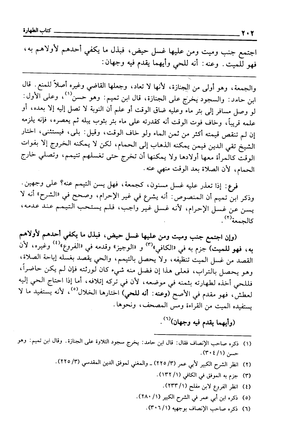 (وَإِنِ اجْتَمَعَ جُنُبٌ وَمَيِّتٌ وَمَنْ عَلَيْهَا غُسْلُ حَيْضٍ، فَبُذِلَ مَا يَكْفِي أَحَدَهُمْ لِأَوْلَاهُمْ بِهِ، فَهُوَ لِلْمَيِّتِ) جَزَمَ بِهِ فِي " الْكَافِي " و" الْوَجِيزِ " وَقَدَّمَهُ فِي " الْفُرُوعِ " وَغَيْرِهِ، لِأَنَّ الْقَصْدَ مِنْ غُسْلِ الْمَيِّتِ تَنْظِيفُهُ، وَلَا يَحْصُلُ بِالتَّيَمُّمِ، وَالْحَيُّ يَقْصِدُ بِغُسْلِهِ إِبَاحَةَ الصَّلَاةِ، وَهُوَ يَحْصُلُ بِالتُّرَابِ، فَعَلَى هَذَا إِنْ فَضَلَ مِنْهُ شَيْءٌ كَانَ لِوَرَثَتِهِ، فَإِنْ لَمْ يَكُنْ حَاضِرًا، فَلِلْحَيِّ أَخْذُهُ لِطَهَارَتِهِ بِثَمَنِهِ فِي مَوْضِعِهِ، لِأَنَّ فِي تَرْكِهِ إِتْلَافَهُ، أَمَّا إِذَا احْتَاجَ الْحَيُّ إِلَيْهِ لِعَطَشٍ، فَهُوَ مُقَدَّمٌ فِي الْأَصَحِّ (وَعَنْهُ: أَنَّهُ لِلْحَيِّ) اخْتَارَهَا الْخَلَّالُ، لِأَنَّهُ يَسْتَفِيدُ مَا لَا يَسْتَفِيدُهُ الْمَيِّتُ مِنَ الْقِرَاءَةِ وَمَسِّ الْمُصْحَفِ، وَنَحْوِهَا.
