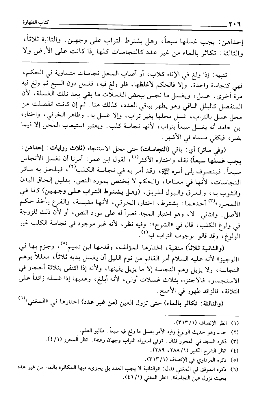 ـــــــــــــــــــــــــــــQتَنْبِيهٌ: إِذَا وَلَغَ فِي الْإِنَاءِ كِلَابٌ، أَوْ أَصَابَ الْمَحَلَّ نَجَاسَاتٌ مُتَسَاوِيَةٌ فِي الْحُكْمِ، فَهِيَ كَنَجَاسَة وَاحِدة، وَإِلَّا فَالْحُكْمُ لِأَغْلَظِهَا، فَلَوْ وَلَغَ فِيهِ فَغُسِلَ دُونَ السَّبْعِ، ثُمَّ وَلَغَ فِيهِ مَرَّةً أُخْرَى غُسِلَ، وَيُغْسَلُ مَا نَجُسَ بِبَعْضِ الْغَسَلَاتِ مَا بَقِيَ بَعْدَ تِلْكَ الْغَسْلَةِ، لِأَنَّ الْمُنْفَصِلَ كَالْبَلَلِ الْبَاقِي، وَهُوَ يُطَهَّرُ بِبَاقِي الْعَدَدِ، كَذَلِكَ هُنَا، ثُمَّ إِنْ كَانَتِ انْفَصَلَتْ عَنْ مَحَلٍّ غُسِلَ بِالتُّرَابِ غُسِلَ مَحَلُّهَا بِغَيْرِ تُرَابٍ، وَإِلَّا غُسِلَ بِهِ، وَظَاهِرُ الْخِرَقِيِّ، وَاخْتَارَهُ ابْنُ حَامِدٍ أَنَّهُ يُغْسَلُ سَبْعًا بِتُرَابٍ، لِأَنَّهَا نَجَاسَةُ كَلْبٍ، وَيُعْتَبَرُ اسْتِيعَابُ الْمَحَلِّ إِلَّا فِيمَا يَضُرُّ، فَيَكْفِي مُسَمَّاهُ فِي الْأَشْهَرِ.
