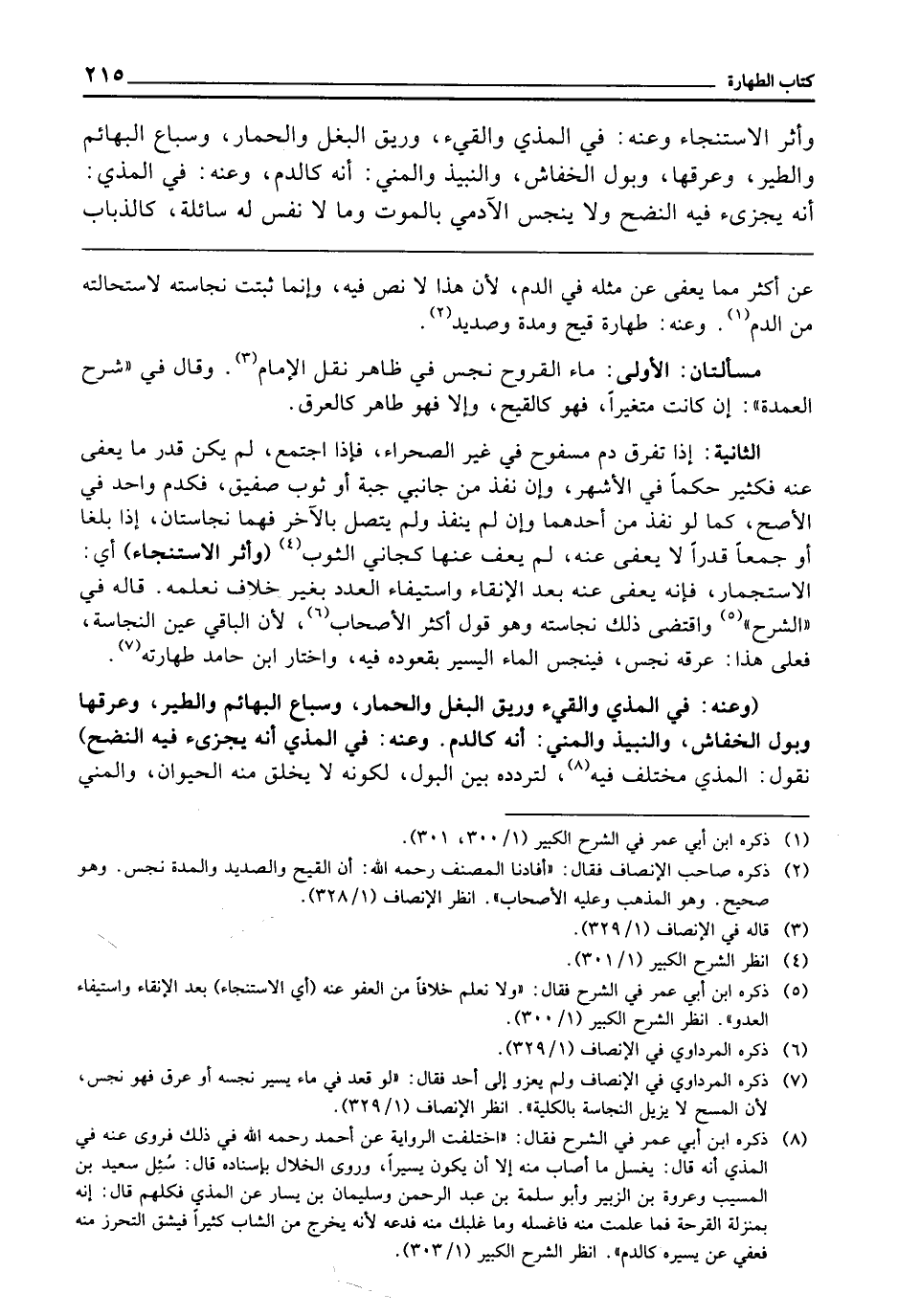 (وَعَنْهُ: فِي الْمَذْيِ وَالْقَيْءِ وَرِيقِ الْبَغْلِ وَالْحِمَارِ وَسِبَاعِ الْبَهَائِمِ وَالطَّيْرِ وَعَرَقِهَا وَبَوْلِ الْخُفَّاشِ، وَالنَّبِيذِ وَالْمَنِيِّ أَنَّهُ كَالدَّمِ، وَعَنْهُ: فِي الْمَذْيِ أَنَّهُ يُجْزِئُ فِيهِ النَّضْحُ) نَقُولُ: الْمَذْيُ مُخْتَلَفٌ فِيهِ لِتَرَدُّدِهِ بَيْنَ الْبَوْلِ، لِكَوْنِهِ لَا يُخْلَقُ مِنْهُ الْحَيَوَانُ، وَالْمَنِيُّ