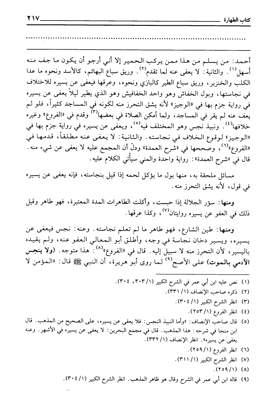 ـــــــــــــــــــــــــــــQأَحْمَدُ: مَنْ يَسْلَمُ مِنْ هَذَا مِمَّنْ يَرْكَبُ الْحَمِيرَ إِلَّا أَنِّي أَرْجُو أَنْ يَكُونَ مَا جَفَّ مِنْهُ أَسْهَلَ، وَالثَّانِيَةُ: لَا يُعْفَى عَنْهُ لِمَا تَقَدَّمَ، وَرِيقُ سِبَاعِ الْبَهَائِمِ كَالْأَسَدِ، وَنَحْوِهِ مَا عَدَا الْكَلْبَ وَالْخِنْزِيرَ، وَرِيقُ سِبَاعِ الطَّيْرِ كَالْبَازِيِّ، وَنَحْوِهِ، وَعَرَقُهَا، فَيُعْفَى عَنْ يَسِيرِهِ لِلِاخْتِلَافِ فِي نَجَاسَتِهَا، وَبَوْلُ الْخُفَّاشِ، وَهُوَ وَاحِدُ الْخَفَافِيشِ، وَهُوَ الَّذِي يَطِيرُ لَيْلًا يُعْفَى عَنْ يَسِيرِهِ فِي رِوَايَةٍ، جَزَمَ بِهَا فِي " الْوَجِيزِ " لِأَنَّهُ يَشُقُّ التَّحَرُّزُ مِنْهُ، لِكَوْنِهِ فِي الْمَسَاجِدِ كَثِيرًا، فَلَوْ لَمْ يُعْفَ عَنْهُ لَمْ يُقَرَّ فِي الْمَسَاجِدِ، وَلَمَا أَمْكَنَ الصَّلَاةُ فِي بَعْضِهَا، وَقَدَّمَ فِي " الْفُرُوعِ " وَغَيْرِهِ خِلَافَهَا، وَنَبِيذٌ نَجِسٌ، وَهُوَ الْمُخْتَلَفُ فِيهِ، وَيُعْفَى عَنْ يَسِيرِهِ فِي رِوَايَةٍ جَزَمَ بِهَا فِي " الْوَجِيزِ " لِوُقُوعِ الْخِلَافِ فِي نَجَاسَتِهِ، وَالثَّانِيَةُ: لَا يُعْفَى عَنْهُ مُطْلَقًا، قَدَّمَهَا فِي " الْفُرُوعِ " وَصَحَّحَهَا فِي " شَرْحِ الْعُمْدَةِ " وَدَلَّ أَنَّ الْمُجْمَعَ عَلَيْهِ لَا يُعْفَى عَنْ شَيْءٍ مِنْهُ، قَالَ فِي " شَرْحِ الْعُمْدَةِ ": رِوَايَةٌ وَاحِدَةٌ، وَالْمَنِيُّ سَيَأْتِي الْكَلَامُ عَلَيْهِ.