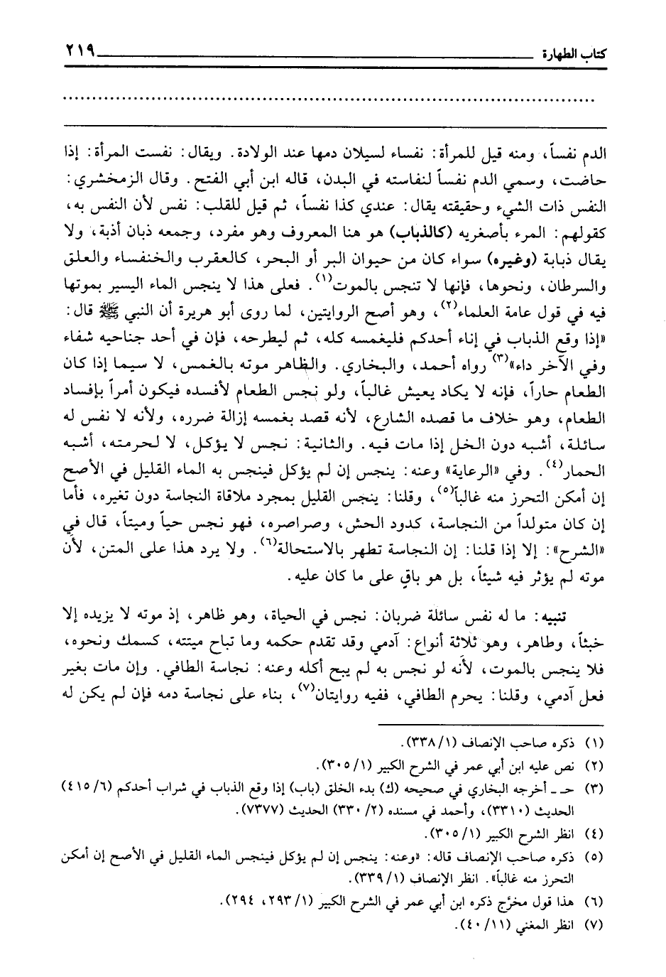 ـــــــــــــــــــــــــــــQالدَّمَ نَفْسًا، وَمِنْهُ قِيلَ: لِلْمَرْأَةِ نُفَسَاءُ، لِسَيَلَانِ دَمِهَا عِنْدَ الْوِلَادَةِ، وَيُقَالُ: نُفِسَتِ الْمَرْأَةُ إِذَا حَاضَتْ، وَسُمِّيَ الدَّمُ نَفْسًا لِنَفَاسَتِهِ فِي الْبَدَنِ، قَالَهُ ابْنُ أَبِي الْفَتْحِ، وَقَالَ الزَّمَخْشَرِيُّ: النَّفْسُ ذَاتُ الشَّيْءِ وَحَقِيقَتُهُ، يُقَالُ: عِنْدِي كَذَا نَفْسًا، ثُمَّ قِيلَ لِلْقَلْبِ: نَفْسٌ، لِأَنَّ النَّفْسَ بِهِ، كَقَوْلِهِمْ: الْمَرْءُ بِأَصْغَرَيْهِ (كَالذُّبَابِ) هُوَ هُنَا الْمَعْرُوفُ، وَهُوَ مُفْرَدٌ، وَجَمْعُهُ ذِبَّانٌ أَذِبَّةٌ، وَلَا يُقَالُ ذُبَابَةٌ (وَغَيْرِهِ) سَوَاءٌ كَانَ مِنْ حَيَوَانِ الْبَرِّ أَوِ الْبَحْرِ كَالْعَقْرَبِ وَالْخُنْفُسَاءِ وَالْعَلَقِ وَالسَّرَطَانِ وَنَحْوِهَا، فَإِنَّهَا لَا تَنْجُسُ بِالْمَوْتِ، فَعَلَى هَذَا لَا يَنْجُسُ الْمَاءُ الْيَسِيرُ بِمَوْتِهَا فِيهِ فِي قَوْلِ عَامَّةِ الْعُلَمَاءِ، وَهُوَ أَصَحُّ الرِّوَايَتَيْنِ لِمَا رَوَى أَبُو هُرَيْرَةَ أَنَّ النَّبِيَّ - صَلَّى اللَّهُ عَلَيْهِ وَسَلَّمَ - قَالَ: «إِذَا وَقَعَ الذُّبَابُ فِي إِنَاءِ أَحَدِكُمْ فَلْيَغْمِسْهُ كُلَّهُ، ثُمَّ لِيَطْرَحْهُ، فَإِنَّ فِي أَحَدِ جَنَاحَيْهِ شِفَاءً، وَفِي الْآخَرِ دَاءً» رَوَاهُ أَحْمَدُ، وَالْبُخَارِيُّ، وَالظَّاهِرُ مَوْتُهُ بِالْغَمْسِ لَا سِيَّمَا إِذَا كَانَ الطَّعَامُ حَارًّا، فَإِنَّهُ لَا يَكَادُ يَعِيشُ غَالِبًا، وَلَوْ نَجَّسَ الطَّعَامَ لَأَفْسَدَهُ، فَيَكُونُ أَمْرًا بِإِفْسَادِ الطَّعَامِ، وَهُوَ خِلَافُ مَا قَصَدَهُ الشَّارِعُ، لِأَنَّهُ قَصَدَ بِغَمْسِهِ إِزَالَةَ ضَرَرِهِ، وَلِأَنَّهُ لَا نَفْسَ لَهُ سَائِلَةٌ، أَشْبَهَ دُودَ الْخَلِّ إِذَا مَاتَ فِيهِ، وَالثَّانِيَةُ: نَجِسٌ لَا يُؤْكَلُ لَا لِحُرْمَتِهِ، أَشْبَهَ الْحِمَارَ، وَفِي " الرِّعَايَةِ " وَعَنْهُ: يَنْجُسُ إِنْ لَمْ يُؤْكَلْ، فَيَنْجُسُ بِهِ الْمَاءُ الْقَلِيلُ فِي الْأَصَحِّ إِنْ أَمْكَنَ التَّحَرُّزُ مِنْهُ غَالِبًا، وَقُلْنَا: يَنْجُسُ الْقَلِيلُ بِمُجَرَّدِ مُلَاقَاةِ النَّجَاسَةِ دُونَ تَغَيُّرِهِ، فَأَمَّا إِنْ كَانَ مُتَوَلِّدًا مِنَ النَّجَاسَةِ كَدُودِ الْحُشِّ، وَصَرَاصِرِهِ، فَهُوَ نَجِسٌ حَيًّا وَمَيِّتًا، قَالَ فِي " الشَّرْحِ ": إِلَّا إِذَا قُلْنَا إِنَّ النَّجَاسَةَ تَطْهُرُ بِالِاسْتِحَالَةِ، وَلَا يَرِدُ هَذَا عَلَى الْمَتْنِ، لِأَنَّ مَوْتَهُ لَمْ يُؤَثِّرْ فِيهِ شَيْئًا، بَلْ هُوَ بَاقٍ عَلَى مَا كَانَ عَلَيْهِ.