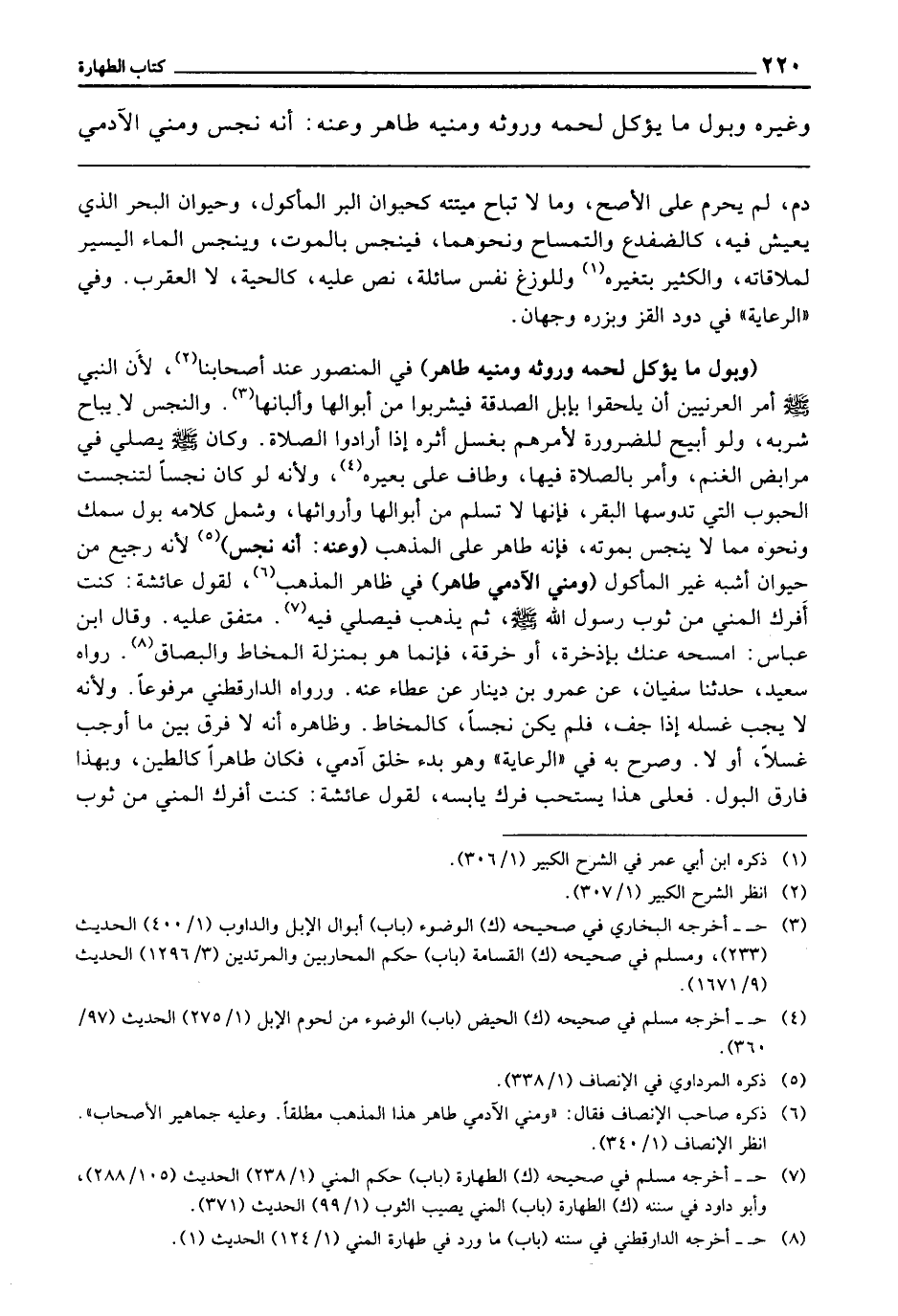(وَبَوْلُ مَا يُؤْكَلُ لَحْمُهُ وَرَوْثُهُ وَمَنِيُّهُ طَاهِرٌ) فِي الْمَنْصُورِ عِنْدَ أَصْحَابِنَا، لِأَنَّ «النَّبِيَّ - صَلَّى اللَّهُ عَلَيْهِ وَسَلَّمَ - أَمَرَ الْعُرَنِيِّينَ أَنْ يَلْحَقُوا بِإِبِلِ الصَّدَقَةِ فَيَشْرَبُوا مِنْ أَبْوَالِهَا وَأَلْبَانِهَا» ، وَالنَّجِسُ لَا يُبَاحُ شُرْبُهُ، وَلَوْ أُبِيحَ لِلضَّرُورَةِ لَأَمَرَهُمْ بِغَسْلِ أَثَرِهِ إِذَا أَرَادُوا الصَّلَاةَ، «وَكَانَ - صَلَّى اللَّهُ عَلَيْهِ وَسَلَّمَ - يُصَلِّي فِي مَرَابِضِ الْغَنَمِ، وَأَمَرَ بِالصَّلَاةِ فِيهَا» ، وَطَافَ عَلَى بَعِيرِهِ، وَلِأَنَّهُ لَوْ كَانَ نَجِسًا لَتَنَجَّسَتِ الْحُبُوبُ الَّتِي تَدُوسُهَا الْبَقَرُ، فَإِنَّهَا لَا تَسْلَمُ مِنْ أَبْوَالِهَا وَأَرْوَاثِهَا، وَشَمَلَ كَلَامُهُ بَوْلَ سَمَكٍ وَنَحْوِهِ مِمَّا لَا يَنْجُسُ بِمَوْتِهِ، فَإِنَّهُ طَاهِرٌ عَلَى الْمَذْهَبِ (وَعَنْهُ: أَنَّهُ نَجِسٌ) لِأَنَّهُ رَجِيعٌ مِنْ حَيَوَانٍ أَشْبَهَ غَيْرَ الْمَأْكُولِ (وَمَنِيُّ الْآدَمِيِّ طَاهِرٌ) فِي ظَاهِرِ الْمَذْهَبِ، «لِقَوْلِ عَائِشَةَ: كُنْتُ أَفْرُكُ الْمَنِيَّ مِنْ ثَوْبِ رَسُولِ اللَّهِ - صَلَّى اللَّهُ عَلَيْهِ وَسَلَّمَ - ثُمَّ يَذْهَبُ فَيُصَلِّي فِيهِ» مُتَّفَقٌ عَلَيْهِ وَقَالَ ابْنُ عَبَّاسٍ: امْسَحْهُ عَنْكَ بِإِذْخِرَةٍ أَوْ خِرْقَةٍ، فَإِنَّمَا هُوَ بِمَنْزِلَةِ الْمُخَاطِ وَالْبُصَاقِ، رَوَاهُ سَعِيدٌ، حَدَّثَنَا سُفْيَانُ عَنْ عَمْرِو بْنِ دِينَارٍ عَنْ عَطَاءٍ عَنْهُ، وَرَوَاهُ الدَّارَقُطْنِيُّ مَرْفُوعًا، وَلِأَنَّهُ لَا يَجِبُ غَسْلُهُ إِذَا جَفَّ، فَلَمْ يَكُنْ نَجِسًا كَالْمُخَاطِ، وَظَاهِرُهُ أَنَّهُ لَا فَرْقَ بَيْنَ مَا أَوْجَبَ غُسْلًا أَوْ لَا، وَصَرَّحَ بِهِ فِي " الرِّعَايَةِ " وَهُوَ بَدْءُ خَلْقِ آدَمِيٍّ فَكَانَ طَاهِرًا كَالطِّينِ، وَبِهَذَا فَارَقَ الْبَوْلَ، فَعَلَى هَذَا يُسْتَحَبُّ فَرْكُ يَابِسِهِ «لِقَوْلِ عَائِشَةَ: كُنْتُ أَفْرُكُ الْمَنِيَّ مِنْ ثَوْبِ