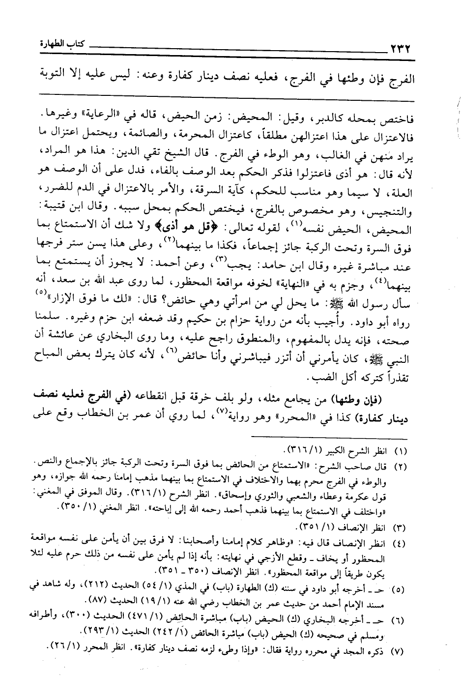 الْفَرْجِ، فَإِنْ وَطِئَهَا فِي الْفَرْجِ، فَعَلَيْهِ نِصْفُ دِينَارٍ كَفَّارَةً، وَعَنْهُ: لَيْسَ عَلَيْهِ إِلَّا التَّوْبَةُ