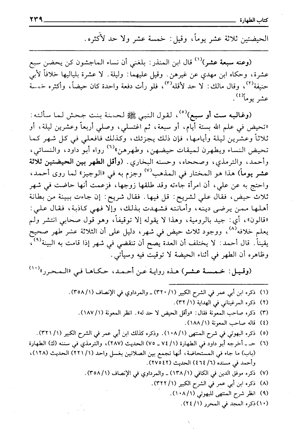 (وَغَالِبُهُ سِتٌّ أَوْ سَبْعٌ) «لِقَوْلِ النَّبِيِّ - صَلَّى اللَّهُ عَلَيْهِ وَسَلَّمَ - لِحَمْنَةَ بِنْتِ جَحْشٍ لَمَّا سَأَلَتْهُ: تَحَيَّضِي فِي عِلْمِ اللَّهِ بِسِتَّةِ أَيَّامٍ أَوْ سَبْعَةٍ، ثُمَّ اغْتَسِلِي، وَصَلِّي أَرْبَعًا وَعِشْرِينَ لَيْلَةً، أَوْ ثَلَاثًا وَعِشْرِينَ لَيْلَةً وَأَيَّامَهَا، فَإِنَّ ذَلِكَ يُجْزِئُكِ، وَكَذَلِكَ فَافْعَلِي فِي كُلِّ شَهْرٍ كَمَا تَحِيضُ النِّسَاءُ وَيَطْهُرْنَ لِمِيقَاتِ حَيْضِهِنَّ وَطُهْرِهِنَّ» رَوَاهُ أَبُو دَاوُدَ، وَالنَّسَائِيُّ، وَأَحْمَدُ، وَالتِّرْمِذِيُّ، وَصَحَّحَاهُ، وَحَسَّنَهُ الْبُخَارِيُّ (وَأَقَلُّ الطُّهْرِ بَيْنَ الْحَيْضَتَيْنِ ثَلَاثَةَ عَشَرَ يَوْمًا) هَذَا هُوَ الْمُخْتَارُ فِي الْمَذْهَبِ، وَجَزَمَ بِهِ فِي " الْوَجِيزِ " لِمَا رَوَى أَحْمَدُ، وَاحْتَجَّ بِهِ عَنْ عَلِيٍّ: أَنَّ امْرَأَةً جَاءَتْهُ، وَقَدْ طَلَّقَهَا زَوْجُهَا، فَزَعَمَتْ أَنَّهَا حَاضَتْ فِي شَهْرٍ ثَلَاثَ حِيَضٍ، فَقَالَ عَلِيٌّ لِشُرَيْحٍ: قُلْ فِيهَا، فَقَالَ شُرَيْحٌ: إِنْ جَاءَتْ بِبَيِّنَةٍ مِنْ بِطَانَةِ أَهْلِهَا مِمَّنْ يُرْضَى دِينُهُ وَأَمَانَتُهُ فَشَهِدَتْ بِذَلِكَ، وَإِلَّا فَهِيَ كَاذِبَةٌ، فَقَالَ عَلِيٌّ: " قَالُونُ " أَيْ: جَيِّدٌ بِالرُّومِيَّةِ، وَهَذَا لَا يَقُولُهُ إِلَّا تَوْقِيفًا، وَهُوَ قَوْلُ صَحَابِيٍّ انْتَشَرَ وَلَمْ يُعْلَمْ خِلَافُهُ، وَوُجُودُ ثَلَاثِ حِيَضٍ فِي شَهْرٍ، دَلِيلٌ عَلَى أَنَّ الثَّلَاثَةَ عَشَرَ طُهْرٌ صَحِيحٌ يَقِينًا، قَالَ أَحْمَدُ: لَا يُخْتَلَفُ أَنَّ الْعِدَّةَ يَصِحُّ أَنْ تَنْقَضِيَ فِي شَهْرٍ إِذَا قَامَتْ بِهِ الْبَيِّنَةُ، وَظَاهِرُهُ أَنَّ الطُّهْرَ فِي أَثْنَاءِ الْحَيْضَةِ لَا تَوْقِيتَ فِيهِ وَسَيَأْتِي.
