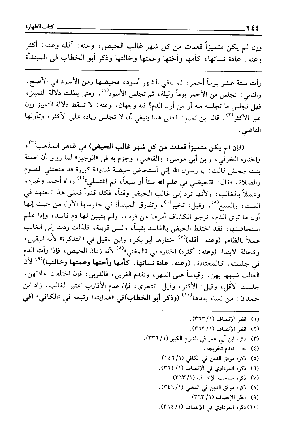 (فَإِنْ لَمْ يَكُنْ مُتَمَيِّزًا قَعَدَتْ مِنْ كُلِّ شَهْرٍ غَالِبَ الْحَيْضِ) فِي ظَاهِرِ الْمَذْهَبِ، وَاخْتَارَهُ الْخِرَقِيُّ، وَابْنُ أَبِي مُوسَى، وَالْقَاضِي، وَجَزَمَ بِهِ فِي " الْوَجِيزِ " لِمَا رُوِيَ أَنَّ حَمْنَةَ بِنْتَ جَحْشٍ قَالَتْ: «يَا رَسُولَ اللَّهِ إِنِّي أُسْتَحَاضُ حَيْضَةً شَدِيدَةً كَبِيرَةً، قَدْ مَنَعَتْنِي الصَّوْمَ وَالصَّلَاةَ، فَقَالَ: تَحَيَّضِي فِي عِلْمِ اللَّهِ سِتًّا أَوْ سَبْعًا، ثُمَّ اغْتَسِلِي» رَوَاهُ أَحْمَدُ، وَغَيْرُهُ، وَعَمَلًا بِالْغَالِبِ، وَلِأَنَّهَا تُرَدُّ إِلَى غَالِبِ الْحَيْضِ وَقْتًا، فَكَذَا قَدْرًا فَعَلَى هَذَا تَجْتَهِدُ فِي السِّتِّ وَالسَّبْعِ، وَقِيلَ: تُخَيَّرُ، وَتُفَارِقُ الْمُبْتَدَأَةُ فِي جُلُوسِهَا الْأَوَّلِ مِنْ حَيْثُ إنَّهَا أَوَّلُ مَا تَرَى الدَّمَ تَرْجُو انْكِشَافَ أَمْرِهَا عَنْ قُرْبٍ، وَلَمْ يَتَبَيَّنْ لَهَا دَمٌ فَاسِدٌ، وَإِذَا عُلِمَ اسْتِحَاضَتُهَا فَقَدِ اخْتَلَطَ الْحَيْضُ بِالْفَاسِدِ يَقِينًا، وَلَيْسَ قَرِينَةً، فَلِذَلِكَ رُدَّتْ إِلَى الْغَالِبِ عَمَلًا بِالظَّاهِرِ (وَعَنْهُ: أَقَلَّهُ) اخْتَارَهَا أَبُو بَكْرٍ، وَابْنُ عَقِيلٍ فِي " التَّذْكِرَةِ "، لِأَنَّهُ الْيَقِينُ، وَكَحَالَةِ الِابْتِدَاءِ (وَعَنْهُ: أَكْثَرَهُ) اخْتَارَهُ فِي " الْمُغْنِي " لِأَنَّهُ زَمَانُ الْحَيْضِ، فَإِذَا رَأَتِ الدَّمَ فِي جلسَته كَالْمُعْتَادَةِ (وَعَنْهُ: عَادَةَ نِسَائِهَا كَأُمِّهَا، وَأُخْتِهَا، وَعَمَّتِهَا، وَخَالَتِهَا) لِأَنَّ الْغَالِبَ شَبَهُهَا بِهِنَّ، وَقِيَاسًا عَلَى الْمَهْرِ، وَتُقَدَّمُ الْقُرْبَى، فَالْقُرْبَى، فَإِنِ اخْتَلَفَتْ عَادَتُهُنَّ جَلَسَتِ الْأَقَلَّ، وَقِيلَ: الْأَكْثَرَ، وَقِيلَ: تَتَحَرَّى، فَإِنْ عُدِمَ الْأَقَارِبُ اعْتُبِرَ الْغَالِبُ. زَادَ ابْنُ حَمْدَانَ: مِنْ نِسَاءِ بَلَدِهَا (وَذَكَرَ أَبُو الْخَطَّابِ) فِي " هِدَايَتِهِ " وَتَبِعَهُ فِي " الْكَافِي " (فِي