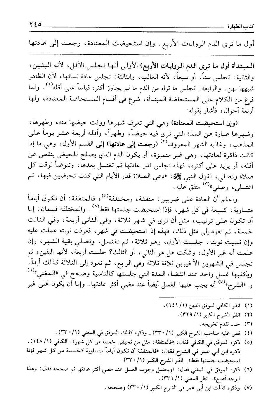 (وَإِنِ اسْتُحِيضَتِ الْمُعْتَادَةُ) وَهِيَ الَّتِي تَعْرِفُ شَهْرَهَا وَوَقْتَ حَيْضِهَا مِنْهُ، وَطُهْرِهَا، وَشَهْرُهَا عِبَارَةٌ عَنِ الْمُدَّةِ الَّتِي تَرَى فِيهِ حَيْضًا، وَطُهْرًا، وَأَقَلُّهُ أَرْبَعَةَ عَشَرَ يَوْمًا عَلَى الْمَذْهَبِ، وَغَالِبُهُ الشَّهْرُ الْمَعْرُوفُ (رَجَعَتْ إِلَى عَادَتِهَا) إِلَى الْقِسْمِ الْأَوَّلِ، وَهِيَ مَا إِذَا كَانَتْ ذَاكِرَةً لِعَادَتِهَا، وَهِيَ غَيْرُ مُتَمَيِّزَةٍ، أَوْ يَكُونُ الدَّمُ الَّذِي يَصْلُحُ لِلْحَيْضِ يَنْقُصُ عَنْ أَقَلِّهِ، أَوْ يَزِيدُ عَلَى أَكْثَرِهِ، فَهَذِهِ تَجْلِسُ قَدْرَ عَادَتِهَا، ثُمَّ تَغْتَسِلُ بَعْدَهَا، وَتَتَوَضَّأُ لِوَقْتِ كُلِّ صَلَاةٍ، وَتُصَلِّي لِقَوْلِ النَّبِيِّ - صَلَّى اللَّهُ عَلَيْهِ وَسَلَّمَ - «دَعِي الصَّلَاةَ قَدْرَ الْأَيَّامِ الَّتِي كُنْتِ تَحِيضِينَ فِيهَا، ثُمَّ اغْتَسِلِي، وَصَلِّي» مُتَّفَقٌ عَلَيْهِ.