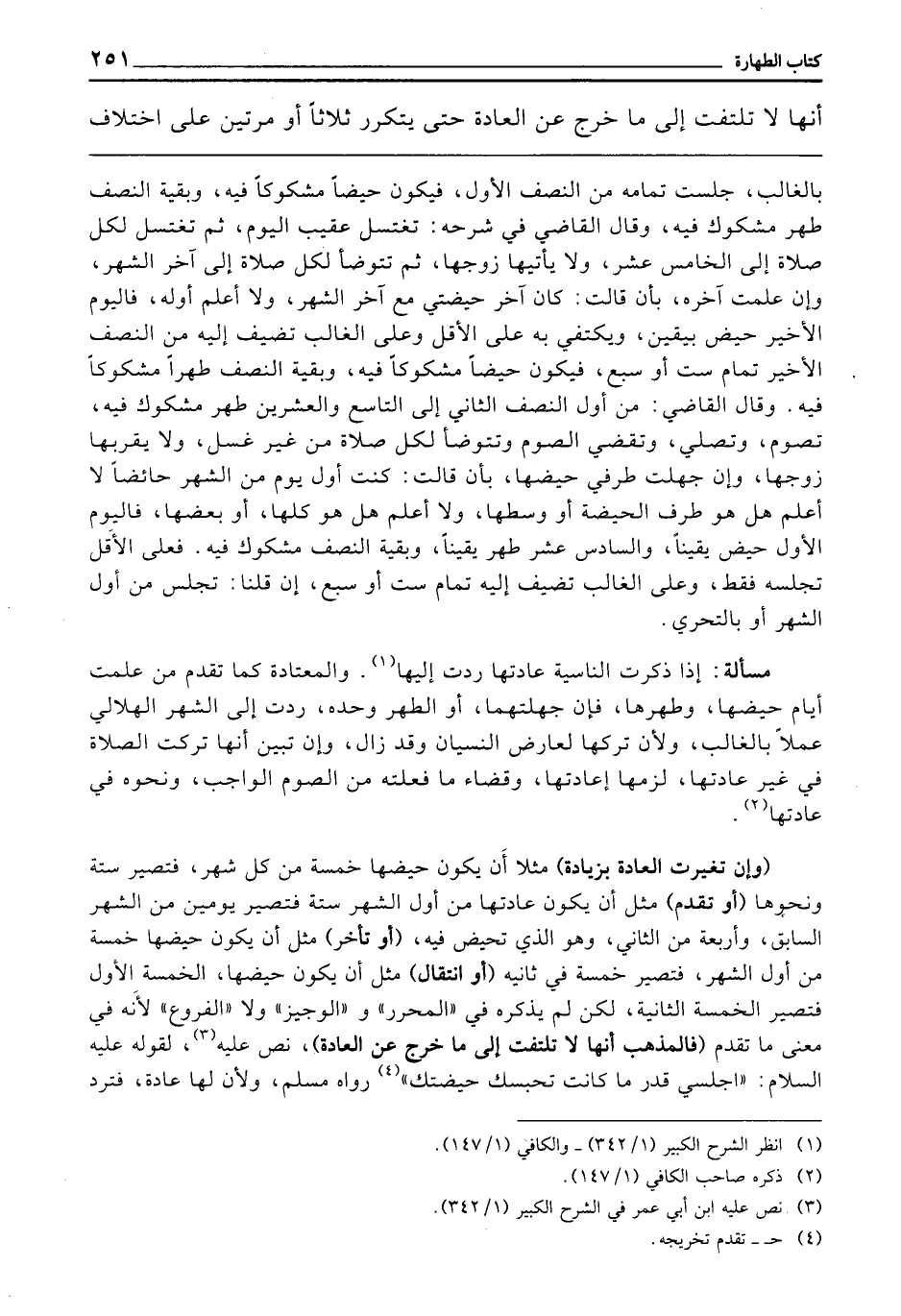 (وَإِنْ تَغَيَّرَتِ الْعَادَةُ بِزِيَادَةٍ) مِثْلَ أَنْ يَكُونَ حَيْضُهَا خَمْسَةً مِنْ كُلِّ شَهْرٍ فَتَصِيرَ سِتَّةً وَنَحْوَهَا (أَوْ تَقَدُّمٍ) مِثْلَ أَنْ يَكُونَ عَادَتُهَا مِنْ أَوَّلِ الشَّهْرِ سِتَّةً فَتَصِيرَ يَوْمَيْنِ مِنَ الشَّهْرِ السَّابِقِ، وَأَرْبَعَةً مِنَ الثَّانِي، وَهُوَ الَّذِي تَحِيضُ فِيهِ (أَوْ تَأَخُّرٍ) مِثْلَ أَنْ يَكُونَ حَيْضُهَا خَمْسَةً مِنْ أَوَّلِ الشَّهْرِ فَتَصِيرُ خَمْسَةً فِي ثَانِيهِ (أَوِ انْتِقَالٍ) مِثْلَ أَنْ يَكُونَ حَيْضُهَا الْخَمْسَةَ الْأُوَلَ، فَتَصِيرَ الْخَمْسَةَ الثَّانِيَةَ، لَكِنْ لَمْ يَذَكُرْهُ فِي " الْمُحَرَّرِ " و" الْوَجِيزِ " وَلَا " الْفُرُوعِ " لِأَنَّهُ فِي مَعْنَى مَا تَقَدَّمَ (فَالْمَذْهَبُ أَنَّهَا لَا تَلْتَفِتُ إِلَى مَا خَرَجَ عَنِ الْعَادَةِ) نَصَّ عَلَيْهِ لِقَوْلِهِ - عَلَيْهِ السَّلَامُ -: «اجْلِسِي قَدْرَ مَا كَانَتْ تَحْبِسُكِ حَيْضَتُكِ» رَوَاهُ مُسْلِمٌ، وَلِأَنَّ لَهَا عَادَةً، فَتُرَدُّ