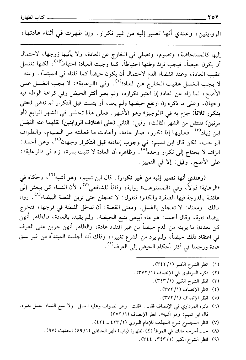 (وَعِنْدِي أَنَّهَا تَصِيرُ إِلَيْهِ مِنْ غَيْرِ تَكْرَارٍ) قَالَ ابْنُ تَمِيمٍ: وَهُوَ أَشْبَهُ، وَحَكَاهُ فِي " الرِّعَايَةِ " قَوْلًا، وَفِي " الْمُسْتَوْعِبِ " رِوَايَةً، وِفَاقًا لِلشَّافِعِيِّ، لِأَنَّ النِّسَاءَ كُنَّ يَبْعَثْنَ إِلَى عَائِشَةَ بِالدُّرَجَةِ فِيهَا الصُّفْرَةُ وَالْكُدْرَةُ، فَتَقُولُ: لَا تَعْجَلْنَ حَتَّى تَرَيْنَ الْقَصَّةَ الْبَيْضَاءَ. رَوَاهُ مَالِكٌ، وَمَعْنَاهُ: لَا تَعْجَلْنَ بِالْغُسْلِ، وَمَعْنَى الْقَصَّةِ أَنْ تُدْخَلَ الْقُطْنَةُ فِي فَرْجِهَا فَتَخْرُجَ بَيْضَاءَ نَقِيَّةً، وَقَالَ أَحْمَدُ: هُوَ مَاءٌ أَبْيَضُ يَتْبَعُ الْحَيْضَةَ، وَلَمْ يُقَيِّدْهُ بِالْعَادَةِ، فَالظَّاهِرُ أَنَّهُنَّ كُنَّ يَعْدُدْنَ مَا يَرَيْنَهُ مِنَ الدَّمِ حَيْضًا مِنْ غَيْرِ افْتِقَادِ عَادَةٍ، وَالظَّاهِرُ أَنَّهُنَّ جَرَيْنَ عَلَى الْعُرْفِ فِي اعْتِقَادِ ذَلِكَ حَيْضًا، وَلَمْ يَرِدْ مِنَ الشَّرْعِ تَغْيِيرُهُ، وَذَلِكَ أَنَّنَا أَجْلَسْنَا الْمُبْتَدَأَةَ مِنْ غَيْرِ سَبْقِ عَادَةٍ، وَرَجَعْنَا فِي أَكْثَرِ أَحْكَامِ الْحَيْضِ إِلَى الْعُرْفِ.