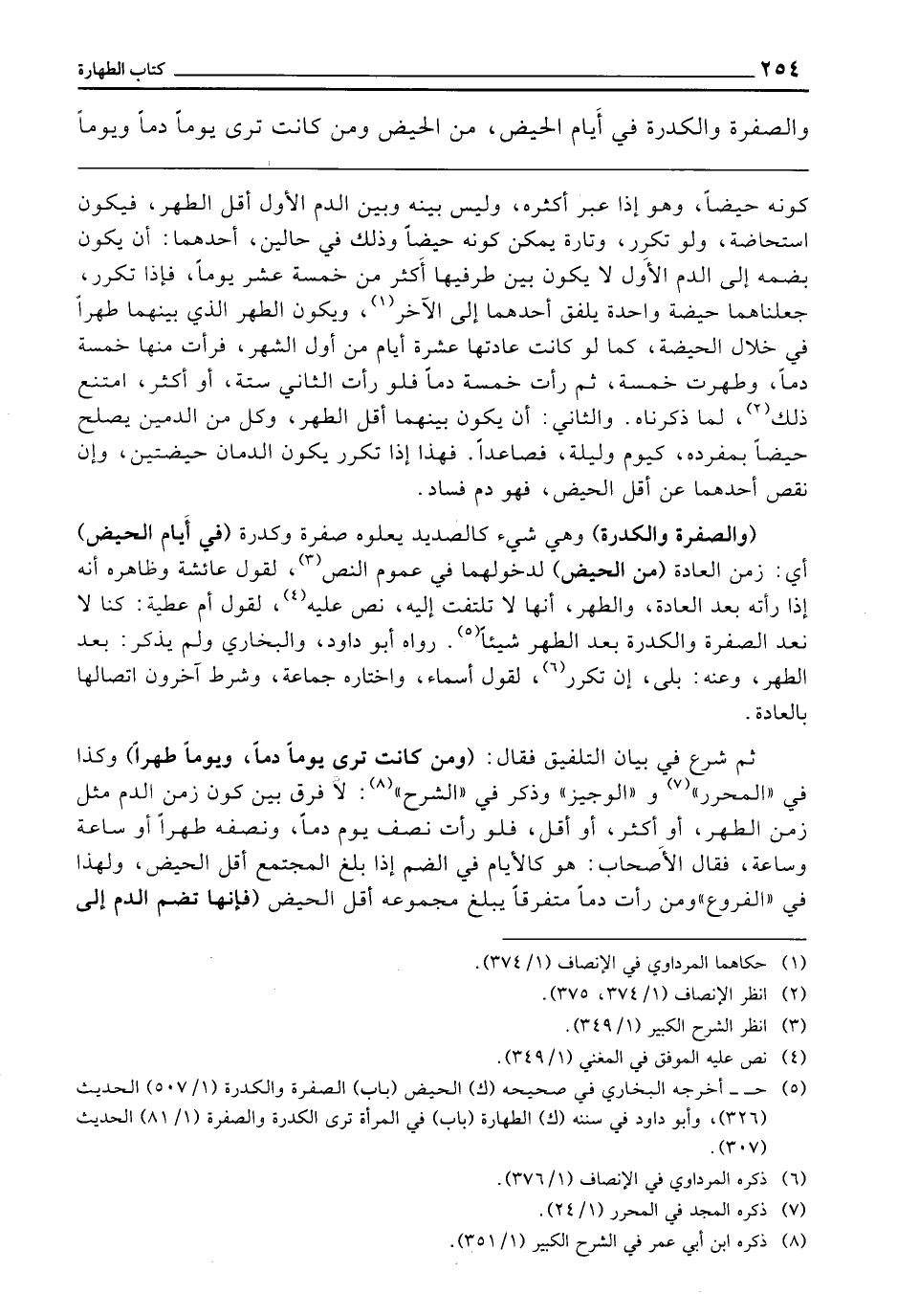 (وَالصُّفْرَةُ وَالْكُدْرَةُ) وَهِيَ شَيْءٌ كَالصَّدِيدِ يَعْلُوهُ صُفْرَةٌ وَكُدْرَةٌ (فِي أَيَّامِ الْحَيْضِ) أَيْ: زَمَنِ الْعَادَةِ (مِنَ الْحَيْضِ) لِدُخُولِهِمَا فِي عُمُومِ النَّصِّ؛ لِقَوْلِ عَائِشَةَ، وَظَاهِرُهُ أَنَّهُ إِذَا رَأَتْهُ بَعْدَ الْعَادَةِ، وَالطُّهْرِ، أَنَّهَا لَا تَلْتَفِتُ إِلَيْهِ، نَصَّ عَلَيْهِ، لِقَوْلِ أُمِّ عَطِيَّةَ: كُنَّا لَا نَعُدُّ الصُّفْرَةَ وَالْكُدْرَةَ بَعْدَ الطُّهْرِ شَيْئًا، رَوَاهُ أَبُو دَاوُدَ، وَالْبُخَارِيُّ، وَلَمْ يَذْكُرْ: بَعْدَ الطُّهْرِ، وَعَنْهُ: بَلَى إِنْ تَكَرَّرَ لِقَوْلِ أَسْمَاءَ، وَاخْتَارَهُ جَمَاعَةٌ، وَشَرَطَ آخَرُونَ اتِّصَالَهَا بِالْعَادَةِ.