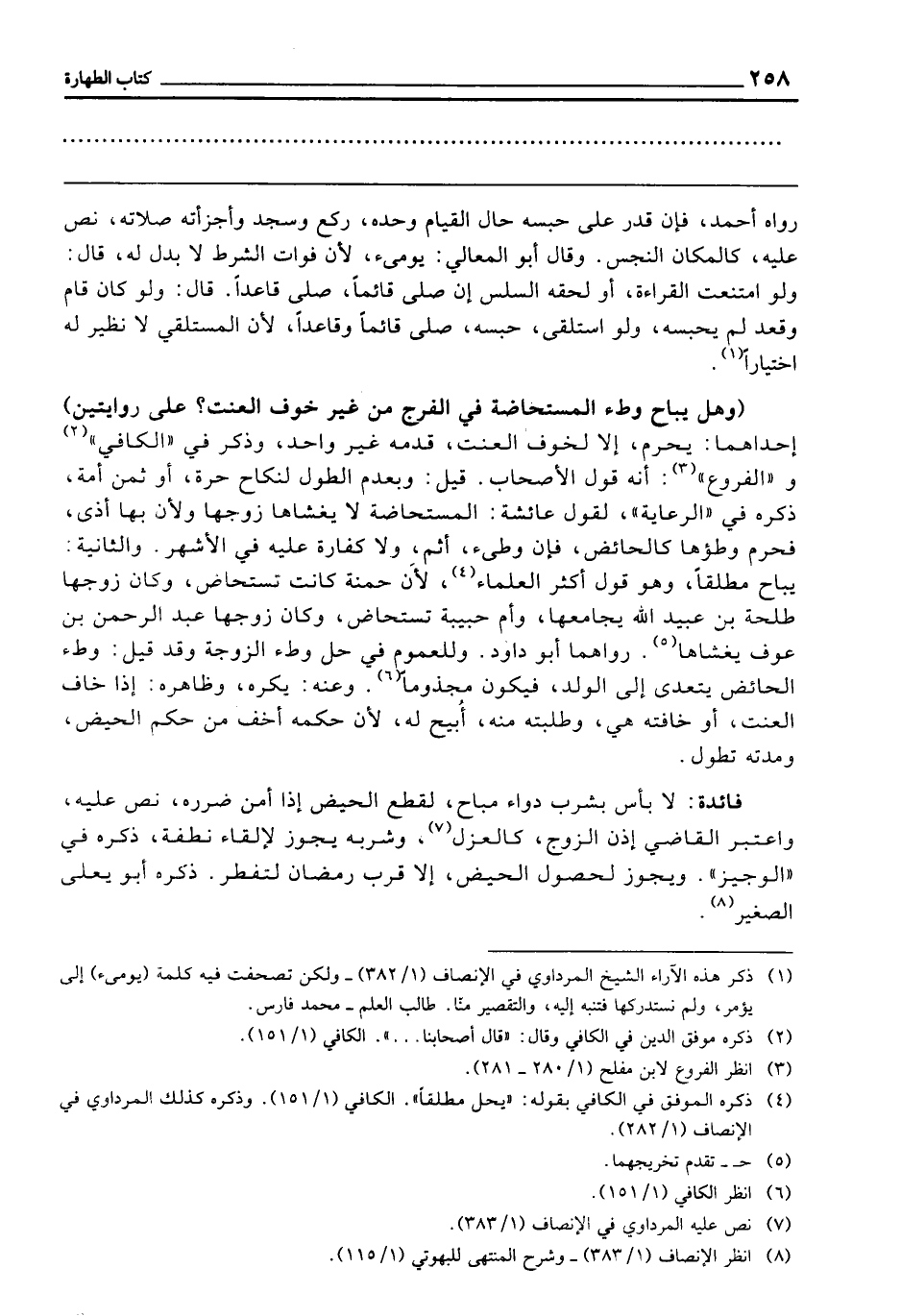 (وَهَلْ يُبَاحُ، وَطْءُ الْمُسْتَحَاضَةِ فِي الْفَرْجِ مِنْ غَيْرِ خَوْفِ الْعَنَتِ؛ عَلَى رِوَايَتَيْنِ) إِحْدَاهُمَا: يَحْرُمُ إِلَّا لِخَوْفِ الْعَنَتِ، قَدَّمَهُ غَيْرُ وَاحِدٍ، وَذَكَرَ فِي " الْكَافِي " و" الْفُرُوعِ " أَنَّهُ قَوْلُ الْأَصْحَابِ قِيلَ: وَبِعَدَمِ الطَّوْلِ لِنِكَاحِ حُرَّةٍ، أَوْ ثَمَنِ أَمَةٍ ذَكَرَهُ فِي " الرِّعَايَةِ " لِقَوْلِ عَائِشَةَ: الْمُسْتَحَاضَةُ لَا يَغْشَاهَا زَوْجُهَا، وَلِأَنَّ بِهَا أَذًى فحرم وطؤها كَالْحَائِضِ، فَإِنْ وَطِئَ أَثِمَ، وَلَا كَفَّارَةَ عَلَيْهِ فِي الْأَشْهَرِ، وَالثَّانِيَةُ: يُبَاحُ مُطْلَقًا، وَهُوَ قَوْلُ أَكْثَرِ الْعُلَمَاءِ، لِأَنَّ حَمْنَةَ كَانَتْ تُسْتَحَاضُ، وَكَانَ زَوْجُهَا طَلْحَةُ بْنُ عُبَيْدِ اللَّهِ يُجَامِعُهَا، وَأُمَّ حَبِيبَةَ تُسْتَحَاضُ، وَكَانَ زَوْجُهَا عَبْدُ الرَّحْمَنِ بْنُ عَوْفٍ يَغْشَاهَا، رَوَاهُمَا أَبُو دَاوُدَ، وَلِلْعُمُومِ فِي حِلِّ وَطْءِ الزَّوْجَةِ، وَقَدْ قِيلَ: وَطْءُ الْحَائِضِ يَتَعَدَّى إِلَى الْوَلَدِ فَيَكُونُ مَجْذُومًا، وَعَنْهُ: يُكْرَهُ، وَظَاهِرُهُ إِذَا خَافَ الْعَنَتَ أَوْ خَافَتْهُ هِيَ، وَطَلَبَتْهُ مِنْهُ أُبِيحَ لَهُ، لِأَنَّ حُكْمَهُ أَخَفُّ مِنْ حُكْمِ الْحَيْضِ، وَمُدَّتُهُ تَطُولُ.