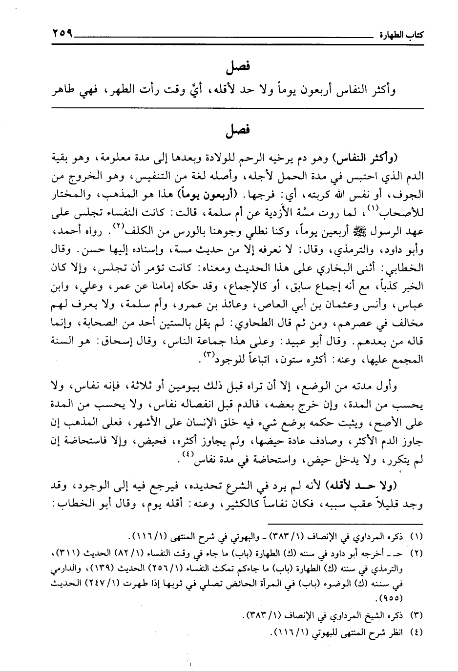 (وَأَكْثَرُ النِّفَاسِ) وَهُوَ دَمٌ يُرْخِيهِ الرَّحِمُ لِلْوِلَادَةِ، وَبَعْدَهَا إِلَى مُدَّةٍ مَعْلُومَةٍ، وَهُوَ بَقِيَّةُ الدَّمِ الَّذِي احْتُبِسَ فِي مُدَّةِ الْحَمْلِ لِأَجْلِهِ، وَأَصْلُهُ لُغَةً مِنَ التَّنْفِيسِ، وَهُوَ الْخُرُوجُ مِنَ الْجَوْفِ، أَوْ نَفَّسَ اللَّهُ كُرْبَتَهُ أَيْ: فَرَّجَهَا (أَرْبَعُونَ يَوْمًا) هَذَا هُوَ الْمَذْهَبُ، وَالْمُخْتَارُ لِلْأَصْحَابِ، لِمَا رَوَتْ مُسَّةُ الْأَزْدِيَّةُ عَنْ أُمِّ سَلَمَةَ قَالَتْ: «كَانَتِ النُّفَسَاءُ تَجْلِسُ عَلَى عَهْدِ الرَّسُولِ - صَلَّى اللَّهُ عَلَيْهِ وَسَلَّمَ - أَرْبَعِينَ يَوْمًا، وَكُنَّا نَطْلِي وُجُوهَنَا بِالْوَرْسِ مِنَ الْكَلَفِ» رَوَاهُ أَحْمَدُ، وَأَبُو دَاوُدَ، وَالتِّرْمِذِيُّ، وَقَالَ: لَا نَعْرِفُهُ إِلَّا مِنْ حَدِيثِ مُسَّةَ، وَإِسْنَادُهُ إِلَيْهَا حَسَنٌ، وَقَالَ الْخَطَّابِيُّ: أَثْنَى الْبُخَارِيُّ عَلَى هَذَا الْحَدِيثِ، وَمَعْنَاهُ كَانَتْ تُؤْمَرُ أَنْ تَجْلِسَ، وَإِلَّا كَانَ الْخَبَرُ كَذِبًا مَعَ أَنَّهُ إِجْمَاعٌ سَابِقٌ أَوْ كَالْإِجْمَاعِ، وَقَدْ حَكَاهُ إِمَامُنَا عَنْ عُمَرَ، وَعَلِيٍّ، وَابْنِ عَبَّاسٍ، وَأَنَسٍ، وَعُثْمَانَ بْنِ أَبِي الْعَاصِ، وَعَائِذِ بْنِ عَمْرٍو، وَأُمِّ سَلَمَةَ، وَلَا يُعْرَفُ لَهُمْ مُخَالِفٌ فِي عَصْرِهِمْ، وَمِنْ ثَمَّ قَالَ الطَّحَاوِيُّ: لَمْ يَقُلْ بِالسِّتِّينَ أَحَدٌ مِنَ الصَّحَابَةِ، وَإِنَّمَا قَالَهُ مَنْ بَعْدَهُمْ، وَقَالَ أَبُو عُبَيْدٍ: وَعَلَى هَذَا جَمَاعَةُ النَّاسِ، وَقَالَ إِسْحَاقُ: هُوَ السُّنَّةُ الْمُجْمَعُ عَلَيْهَا، وَعَنْهُ: أَكْثَرُهُ سِتُّونَ اتِّبَاعًا لِلْوُجُودِ.