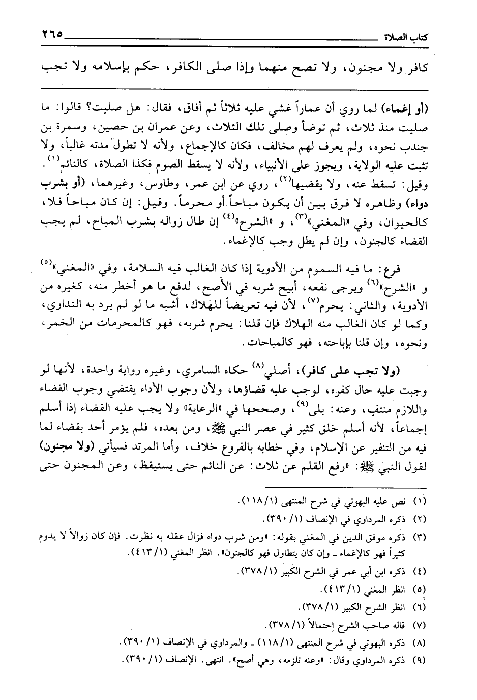 (وَلَا تَجِبُ عَلَى كَافِرٍ) أَصْلِيٍّ حَكَاهُ السَّامِرِيُّ، وَغَيْرُهُ رِوَايَةً وَاحِدَةً، لِأَنَّهَا لَوْ وَجَبَتْ عَلَيْهِ حَالَ كُفْرِهِ لَوَجَبَ عَلَيْهِ قَضَاؤُهَا، وَلِأَنَّ وُجُوبَ الْأَدَاءِ يَقْتَضِي وُجُوبَ الْقَضَاءِ وَاللَّازِمُ مُنْتَفٍ، وَعَنْهُ: بَلَى، وَصَحَّحَهَا فِي " الرِّعَايَةِ " وَلَا يَجِبُ عَلَيْهِ الْقَضَاءُ إِذَا أَسْلَمَ إِجْمَاعًا، لِأَنَّهُ أَسْلَمَ خَلْقٌ كَثِيرٌ فِي عَصْرِ النَّبِيِّ - صَلَّى اللَّهُ عَلَيْهِ وَسَلَّمَ - وَمِنْ بَعْدِهِ، فَلَمْ يُؤْمَرْ أَحَدٌ بِقَضَاءٍ لِمَا فِيهِ مِنَ التَّنْفِيرِ عَنِ الْإِسْلَامِ، وَفِي خِطَابِهِ بِالْفُرُوعِ خِلَافٌ، وَأَمَّا الْمُرْتَدُّ فَسَيَأْتِي (وَلَا مَجْنُونٍ) لِقَوْلِ النَّبِيِّ - صَلَّى اللَّهُ عَلَيْهِ وَسَلَّمَ -: «رُفِعَ الْقَلَمُ عَنْ ثَلَاثٍ، عَنِ النَّائِمِ حَتَّى يَسْتَيْقِظَ، وَعَنِ الْمَجْنُونِ حَتَّى