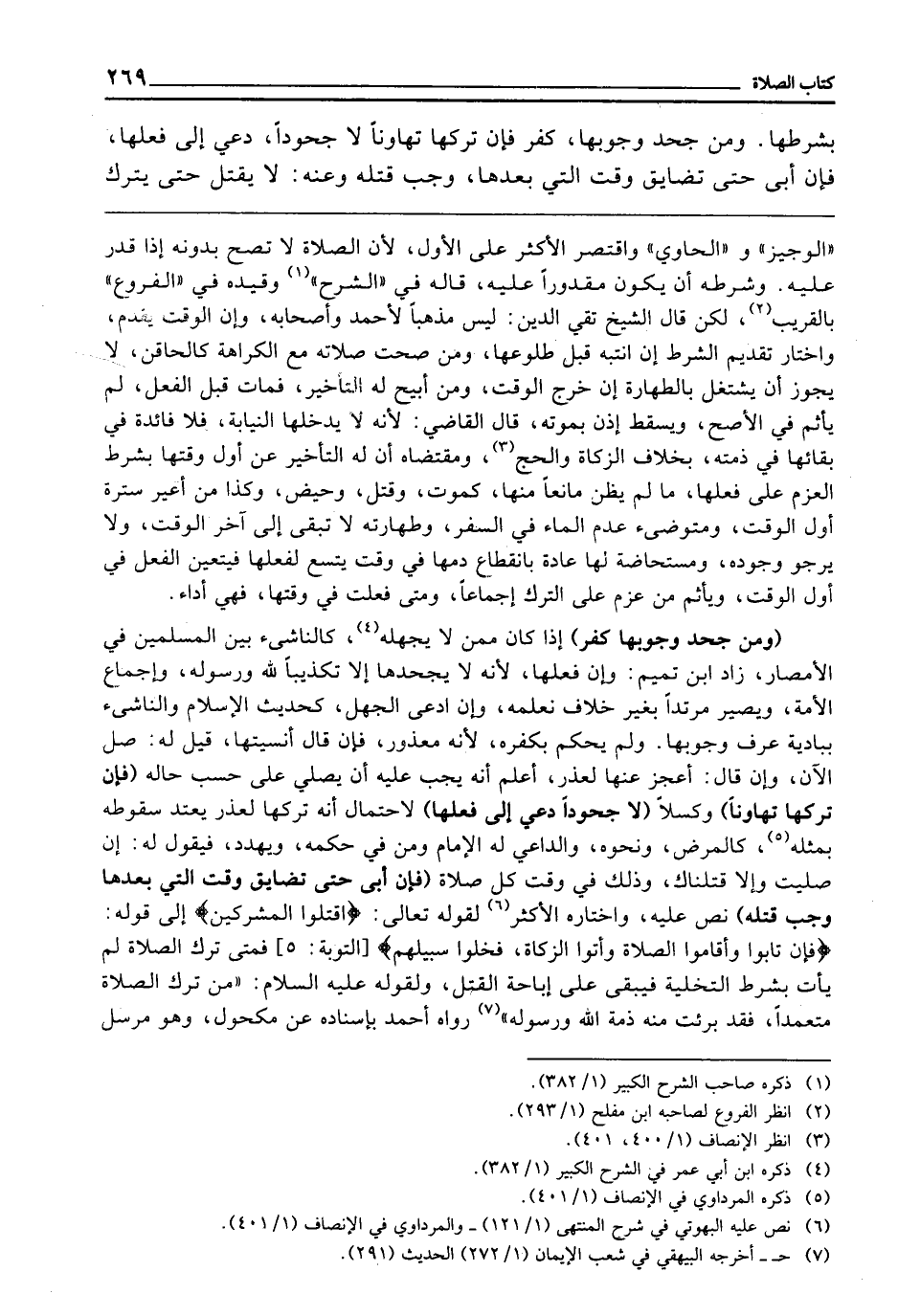 وَمَنْ جَحَدَ وُجُوبَهَا كَفَرَ، فَإِنْ تَرَكَهَا تَهَاوُنًا لَا جُحُودًا، دُعِيَ إِلَى فِعْلِهَا، فَإِنْ أَبَى حَتَّى تَضَايَقَ وَقْتُ الَّتِي بَعْدَهَا، وَجَبَ قَتْلُهُ، وَعَنْهُ: لَا يُقْتَلُ حَتَّى يَتْرُكَ