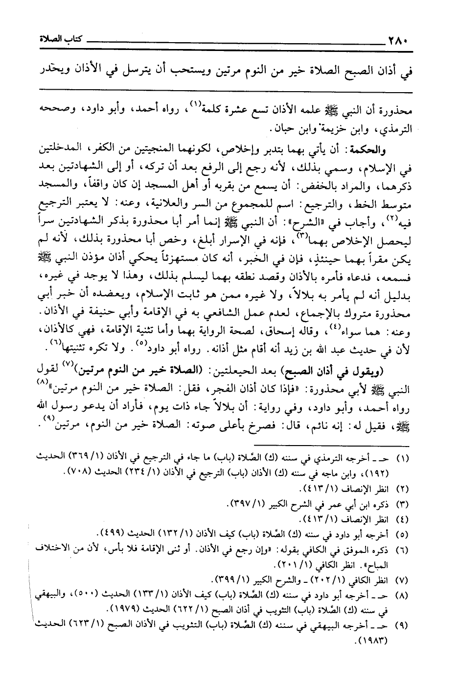 (وَيَقُولُ فِي أَذَانِ الصُّبْحِ) بَعْدَ الْحَيْعَلَتَيْنِ: (الصَّلَاةُ خَيْرٌ مِنَ النَّوْمِ مَرَّتَيْنِ) لِقَوْلِ النَّبِيِّ - صَلَّى اللَّهُ عَلَيْهِ وَسَلَّمَ - لِأَبِي مَحْذُورَةَ: «فَإِذَا كَانَ أَذَانُ الْفَجْرِ فَقُلِ: الصَّلَاةُ خَيْرٌ مِنَ النَّوْمِ مَرَّتَيْنِ» رَوَاهُ أَحْمَدُ، وَأَبُو دَاوُدَ، وَفِي رِوَايَةٍ: «أَنَّ بِلَالًا جَاءَ ذَاتَ يَوْمٍ فَأَرَادَ أَنْ يَدْعُوَ رَسُولَ اللَّهِ - صَلَّى اللَّهُ عَلَيْهِ وَسَلَّمَ - فَقِيلَ لَهُ: إِنَّهُ نَائِمٌ، قَالَ: فَصَرَخَ بِأَعْلَى صَوْتِهِ: الصَّلَاةُ خَيْرٌ مِنَ النَّوْمِ مَرَّتَيْنِ