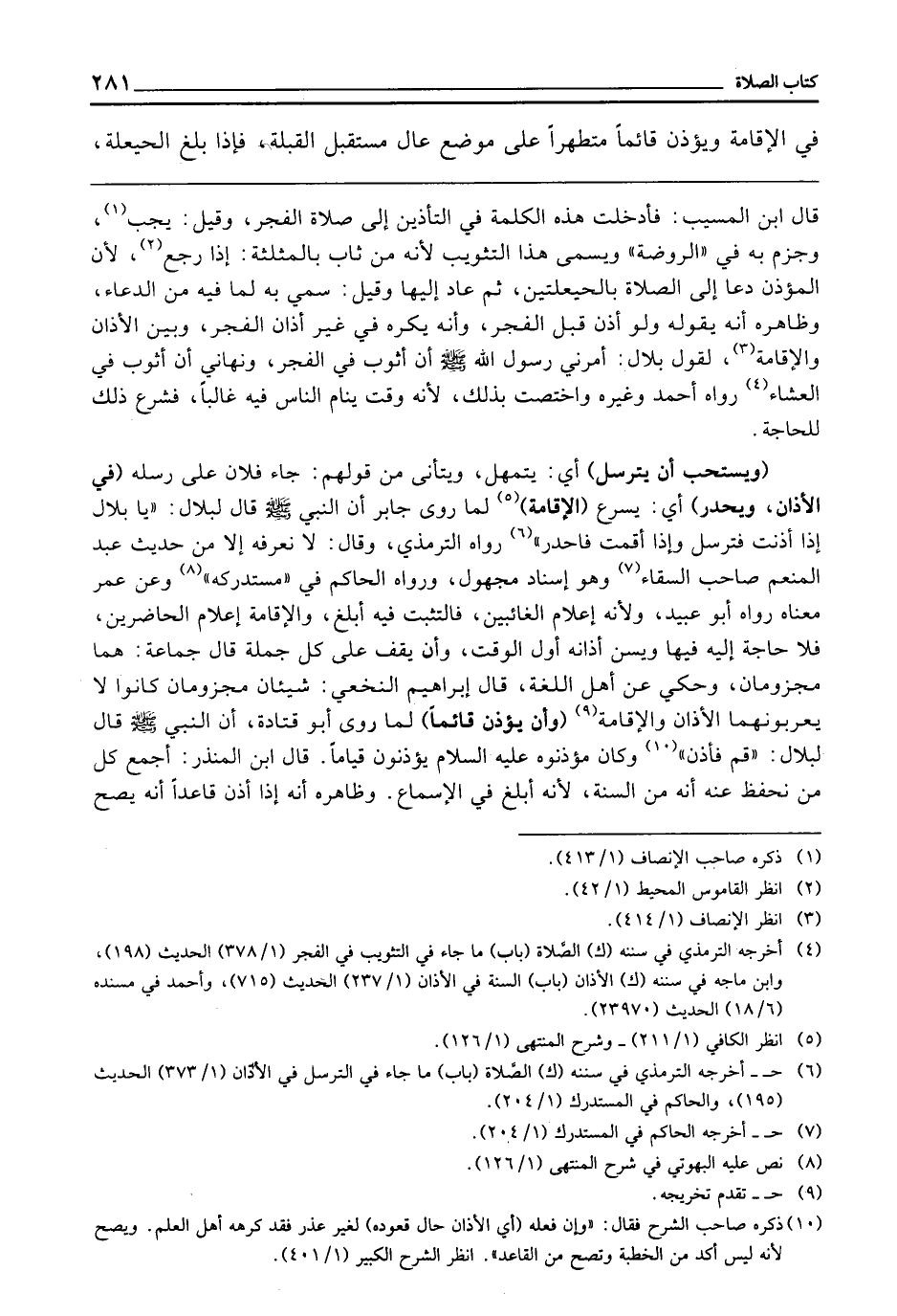 (وَيُسْتَحَبُّ أَنْ يَتَرَسَّلَ) أَيْ: يَتَمَهَّلَ، وَيَتَأَنَّى مِنْ قَوْلِهِمْ: جَاءَ فُلَانٌ عَلَى رِسْلِهِ (فِي الْأَذَانِ وَيَحْدُرَ) أَيْ: يُسْرِعَ (الْإِقَامَةِ) لِمَا رَوَى جَابِرٌ أَنَّ النَّبِيَّ - صَلَّى اللَّهُ عَلَيْهِ وَسَلَّمَ - قَالَ لِبِلَالٍ: «يَا بِلَالُ إِذَا أَذَّنْتَ فَتَرَسَّلْ، وَإِذَا أَقَمْتَ فَاحْدُرْ» رَوَاهُ التِّرْمِذِيُّ، وَقَالَ: لَا نَعْرِفُهُ إِلَّا مِنْ حَدِيثِ عَبْدِ الْمُنْعِمِ صَاحِبِ السِّقَاءِ، وَهُوَ إِسْنَادٌ مَجْهُولٌ، وَرَوَاهُ الْحَاكِمُ فِي " مُسْتَدْرَكِهِ " وَعَنْ عُمَرَ مَعْنَاهُ رَوَاهُ أَبُو عُبَيْدٍ، وَلِأَنَّهُ إِعْلَامُ الْغَائِبِينَ، فَالتَّثَبُّتُ فِيهِ أَبْلَغُ، وَالْإِقَامَةَ إِعْلَامُ الْحَاضِرِينَ فَلَا حَاجَةَ إِلَيْهِ فِيهَا، وَيُسَنُّ أَذَانُهُ أَوَّلَ الْوَقْتِ، وَأَنْ يَقِفَ عَلَى كُلِّ جُمْلَةٍ، قَالَ جَمَاعَةٌ: هُمَا مَجْزُومَانِ، وَحُكِيَ عَنْ أَهْلِ اللُّغَةِ، قَالَ إِبْرَاهِيمُ النَّخَعِيُّ: شَيْئَانِ مَجْزُومَانِ كَانُوا لَا يُعْرِبُونَهُمَا الْأَذَانُ وَالْإِقَامَةُ.