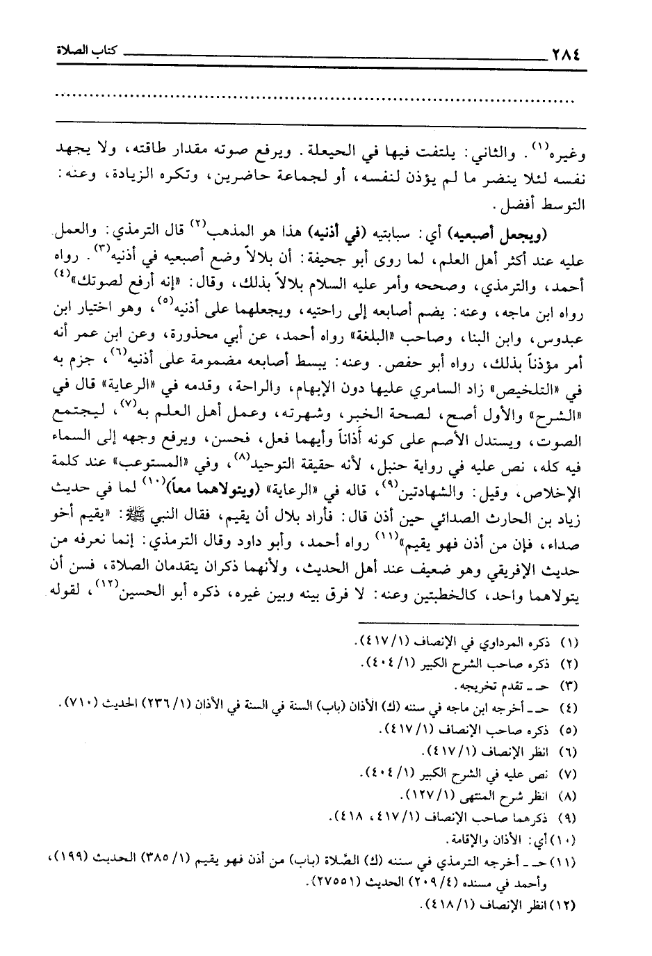 (وَيَجْعَلَ أُصْبُعَيْهِ) أَيْ: سَبَّابَتَيْهِ (فِي أُذُنَيْهِ) هَذَا هُوَ الْمَذْهَبُ، قَالَ التِّرْمِذِيُّ: وَالْعَمَلُ عَلَيْهِ عِنْدَ أَكْثَرِ أَهْلِ الْعِلْمِ، لِمَا رَوَى أَبُو جُحَيْفَةَ: «أَنَّ بِلَالًا وَضَعَ أُصْبُعَيْهِ فِي أُذُنَيْهِ» رَوَاهُ أَحْمَدُ، وَالتِّرْمِذِيُّ، وَصَحَّحَهُ، وَأَمَرَ - عَلَيْهِ السَّلَامُ - بِلَالًا بِذَلِكَ، وَقَالَ: «إِنَّهُ أَرْفَعُ لِصَوْتِكَ» رَوَاهُ ابْنُ مَاجَهْ، وَعَنْهُ: يَضُمُّ أَصَابِعَهُ إِلَى رَاحَتَيْهِ، وَيَجْعَلُهُمَا عَلَى أُذُنَيْهِ، وَهُوَ اخْتِيَارُ ابْنِ عَبْدُوسٍ، وَابْنِ الْبَنَّا، وَصَاحِبِ " الْبُلْغَةِ "، رَوَاهُ أَحْمَدُ عَنْ أَبِي مَحْذُورَةَ، وَعَنِ ابْنِ عُمَرَ: أَنَّهُ أَمَرَ مُؤَذِّنًا بِذَلِكَ، رَوَاهُ أَبُو حَفْصٍ، وَعَنْهُ: يَبْسُطُ أَصَابِعَهُ مَضْمُومَةً عَلَى أُذُنَيْهِ، جَزَمَ بِهِ فِي " التَّلْخِيصِ " زَادَ السَّامِرِيُّ عَلَيْهَا دُونَ الْإِبْهَامِ، وَالرَّاحَةِ، وَقَدَّمَهُ فِي " الرِّعَايَةِ " قَالَ فِي " الشَّرْحِ ": وَالْأَوَّلُ أَصَحُّ لِصِحَّةِ الْخَبَرِ، وَشُهْرَتِهِ، وَعَمَلِ أَهْلِ الْعِلْمِ بِهِ، لِيَجْتَمِعَ الصَّوْتُ وَيَسْتَدِلَّ الْأَصَمُّ عَلَى كَوْنِهِ أَذَانَا، وَأَيُّهُمَا فُعِلَ فَحَسَنٌ، وَيَرْفَعُ وَجْهَهُ إِلَى السَّمَاءِ فِيهِ كُلِّهِ، نَصَّ عَلَيْهِ فِي رِوَايَةِ حَنْبَلٍ، لِأَنَّهُ حَقِيقَةُ التَّوْحِيدِ، وَفِي " الْمُسْتَوْعِبِ " عِنْدَ كَلِمَةِ الْإِخْلَاصِ، وَقِيلَ: وَالشَّهَادَتَيْنِ، قَالَهُ فِي " الرِّعَايَةِ " (وَيَتَوَلَّاهُمَا مَعًا) لِمَا فِي حَدِيثِ زِيَادِ بْنِ الْحَارِثِ الصُّدَائِيِّ حِينَ أَذَّنَ قَالَ: «فَأَرَادَ بِلَالٌ أَنْ يُقِيمَ فَقَالَ النَّبِيُّ - صَلَّى اللَّهُ عَلَيْهِ وَسَلَّمَ -: يُقِيمُ أَخُو صُدَاءٍ، فَإِنَّ مَنْ أَذَّنَ فَهُوَ يُقِيمُ» رَوَاهُ أَحْمَدُ، وَأَبُو دَاوُدَ، وَقَالَ التِّرْمِذِيُّ: إنما نعرفه مِنْ حَدِيثِ الْإِفْرِيقِيِّ، وَهُوَ ضَعِيفٌ عِنْدَ أَهْلِ الْحَدِيثِ، وَلِأَنَّهُمَا ذِكْرَانِ يَتَقَدَّمَانِ الصَّلَاةَ، فَسُنَّ أَنْ يَتَوَلَّاهُمَا وَاحِدٌ، كَالْخُطْبَتَيْنِ، وَعَنْهُ: لَا فَرْقَ بَيْنَهُ وَبَيْنَ غَيْرِهِ، ذَكَرَهُ أَبُو الْحُسَيْنِ، لِقَوْلِهِ