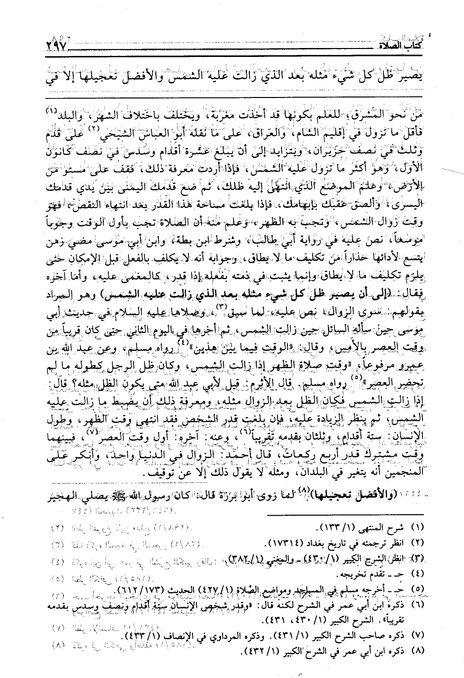 ـــــــــــــــــــــــــــــQمِنْ نَحْوِ الْمَشْرِقِ، لِلْعِلْمِ بِكَوْنِهَا قَدْ أَخَذَتْ مُغْرِبَةً، وَيَخْتَلِفُ بِاخْتِلَافِ الشَّهْرِ، وَالْبَلَدِ، فَأَقَلُّ مَا تَزُولُ فِي إِقْلِيمِ الشَّامِ وَالْعِرَاقِ عَلَى مَا نَقَلَهُ أَبُو الْعَبَّاسِ الشِّيحِيُّ عَلَى قَدَمٍ وَثُلُثٍ فِي نِصْفِ حُزَيْرَانَ، وَيَتَزَايَدُ إِلَى أَنْ يَبْلُغَ عَشْرَةَ أَقْدَامٍ وَسُدُسٍ فِي نِصْفِ كَانُونَ الْأَوَّلِ، وَهُوَ أَكْثَرُ مَا تَزُولُ عَلَيْهِ الشَّمْسُ، فَإِذَا أَرَدْتَ مَعْرِفَةَ ذَلِكَ، فَقِفْ عَلَى مُسْتَوٍ مِنَ الْأَرْضِ، وَعَلِّمِ الْمَوْضِعَ الَّذِي انْتَهَى إِلَيْهِ ظِلُّكَ، ثُمَّ ضَعْ قَدَمَكَ الْيُمْنَى بَيْنَ يَدَيْ قَدَمِكَ الْيُسْرَى، وَأَلْصِقْ عَقِبَكَ بِإِبْهَامِكَ، فَإِذَا بَلَغَتْ مِسَاحَةَ هَذَا الْقَدْرِ بَعْدَ انْتِهَاءِ النَّقْصِ فَهُوَ وَقْتُ زَوَالِ الشَّمْسِ، وَتَجِبُ بِهِ الظُّهْرُ، وَعُلِمَ مِنْهُ أَنَّ الصَّلَاةَ تَجِبُ بِأَوَّلِ الْوَقْتِ وُجُوبًا مُوَسَّعًا، نَصَّ عَلَيْهِ فِي رِوَايَةِ أَبِي طَالِبٍ، وَشَرَطَ ابْنُ بَطَّةَ، وَابْنُ أَبِي مُوسَى مُضِيَّ زَمَنٍ يَتَّسِعُ لِأَدَائِهَا حِذَارًا مِنْ تَكْلِيفِ مَا لَا يُطَاقُ، وَجَوَابُهُ أَنَّهُ لَا يُكَلَّفُ بِالْفِعْلِ قَبْلَ الْإِمْكَانِ حَتَّى يُلْزَمَ تَكْلِيفَ مَا لَا يُطَاقُ، وَإِنَّمَا يَثْبُتُ فِي ذِمَّتِهِ بِفِعْلِهِ إِذَا قَدَرَ، كَالْمُغْمَى عَلَيْهِ، وَأَمَّا آخِرُهُ فَقَالَ: (إِلَى أَنْ يَصِيرَ ظِلُّ كُلِّ شَيْءٍ مِثْلَهُ بَعْدَ الَّذِي زَالَتْ عَلَيْهِ الشَّمْسُ) وَهُوَ الْمُرَادُ بِقَوْلِهِمْ سِوَى الزَّوَالِ، نَصَّ عَلَيْهِ لِمَا سَبَقَ، وَصَلَّاهَا - عَلَيْهِ السَّلَامُ - فِي حَدِيثِ أَبِي مُوسَى حِينَ سَأَلَهُ السَّائِلُ حِينَ زَالَتِ الشَّمْسُ، ثُمَّ أَخَّرَهَا فِي الْيَوْمِ الثَّانِي: حَتَّى كَانَ قَرِيبًا مِنْ وَقْتِ الْعَصْرِ بِالْأَمْسِ، وَقَالَ: «الْوَقْتُ فِيمَا بَيْنَ هَذَيْنِ» رَوَاهُ مُسْلِمٌ، وَعَنْ عَبْدِ اللَّهِ بْنِ عَمْرٍو مَرْفُوعًا: «وَقْتُ صَلَاةِ الظُّهْرِ إِذَا زَالَتِ الشَّمْسُ، وَكَانَ ظِلُّ الرَّجُلِ كَطُولِهِ، مَا لَمْ تَحْضُرِ الْعَصْرُ» رَوَاهُ مُسْلِمٌ، قَالَ الْأَثْرَمُ: قِيلَ لِأَبِي عَبْدِ اللَّهِ: مَتَى يَكُونُ الظِّلُّ مِثْلَهُ؟ قَالَ: إِذَا زَالَتِ الشَّمْسُ فَكَانَ الظِّلُّ بَعْدَ الزَّوَالِ مِثْلَهُ، وَمَعْرِفَةُ ذَلِكَ أَنْ يَضْبُطَ مَا زَالَتْ عَلَيْهِ الشَّمْسُ، ثُمَّ يَنْظُرَ الزِّيَادَةَ عَلَيْهِ، فَإِنْ بَلَغَتْ قَدْرَ الشَّخْصِ فَقَدِ انْتَهَى وَقْتُ الظُّهْرِ، وَطُولُ الْإِنْسَانِ سِتَّةُ أَقْدَامٍ وَثُلُثَانِ بِقَدَمِهِ تَقْرِيبًا، وَعَنْهُ: آخِرُهُ أَوَّلُ وَقْتِ الْعَصْرِ فَبَيْنَهُمَا وَقْتٌ مُشْتَرَكٌ قَدْرَ أَرْبَعِ رَكَعَاتٍ، قَالَ أَحْمَدُ: الزَّوَالُ فِي الدُّنْيَا وَاحِدٌ، وَأَنْكَرَ عَلَى الْمُنَجِّمِينَ أَنَّهُ يَتَغَيَّرُ فِي الْبُلْدَانِ، وَمِثْلُهُ لَا يَقُولُ ذَلِكَ إِلَّا عَنْ تَوْقِيفٍ.